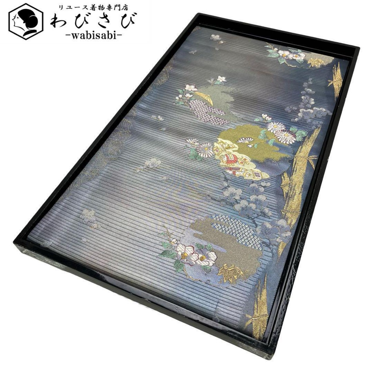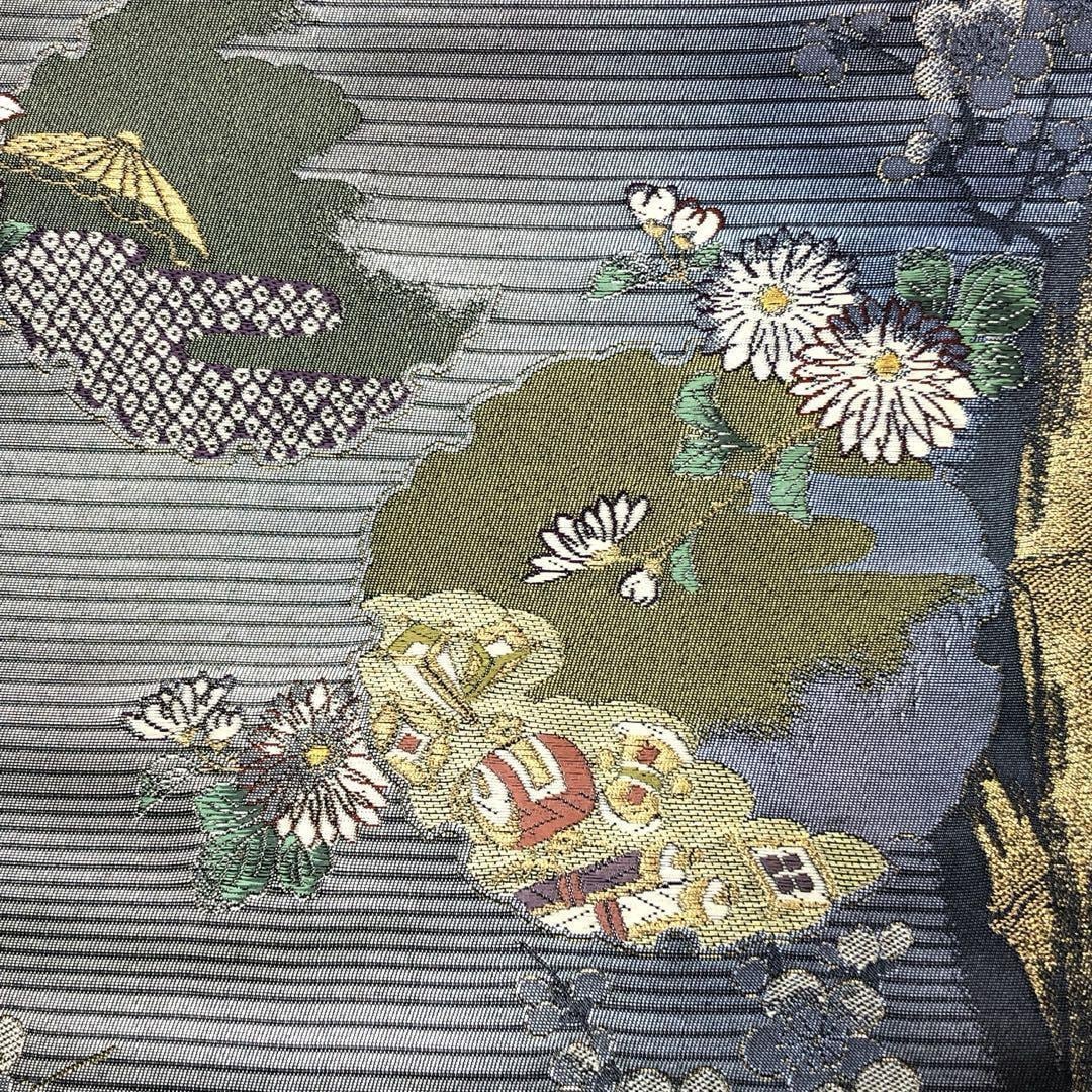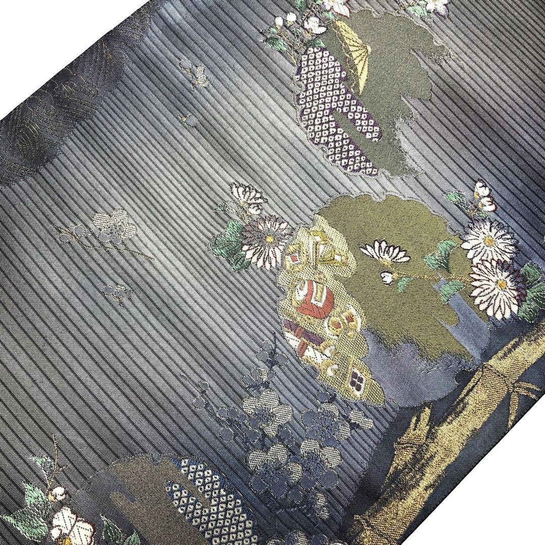 錫紵色のお色味に横縞模様、雪輪に花模様、宝尽くしなどの柄裄がデザインされた素敵なお品でございます。