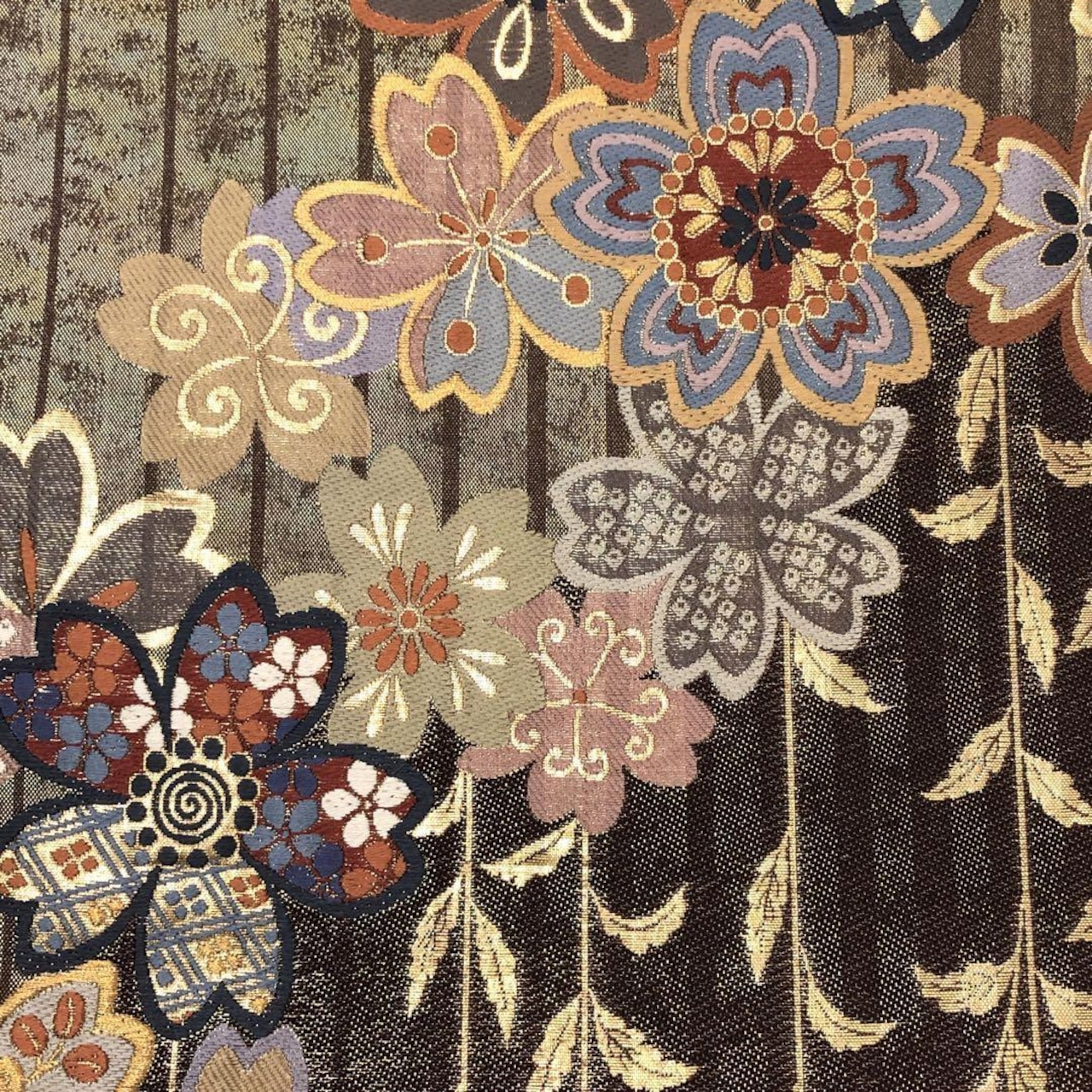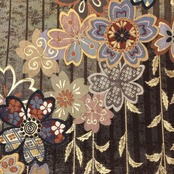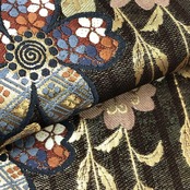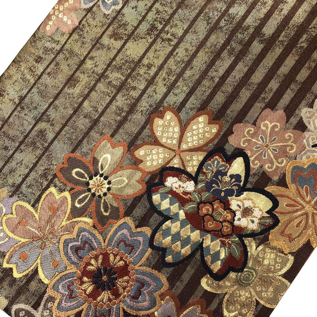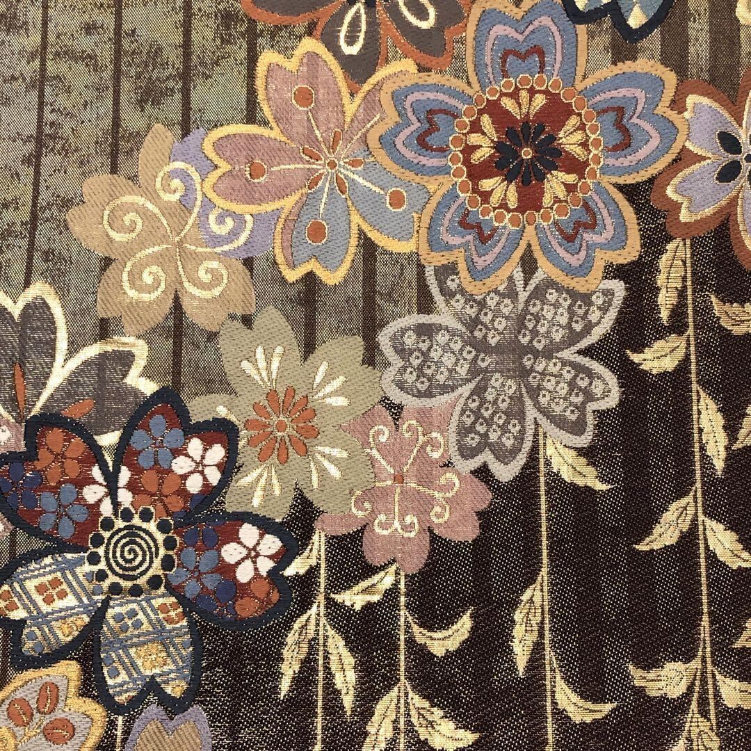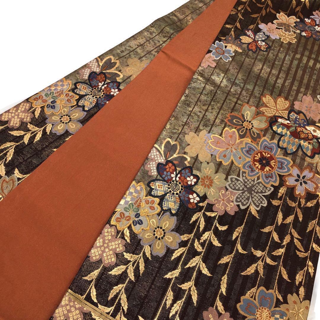 焦茶色のお色味に桜の花に花菱や鹿子模様などの柄裄がデザインされた素敵なお品でございます。