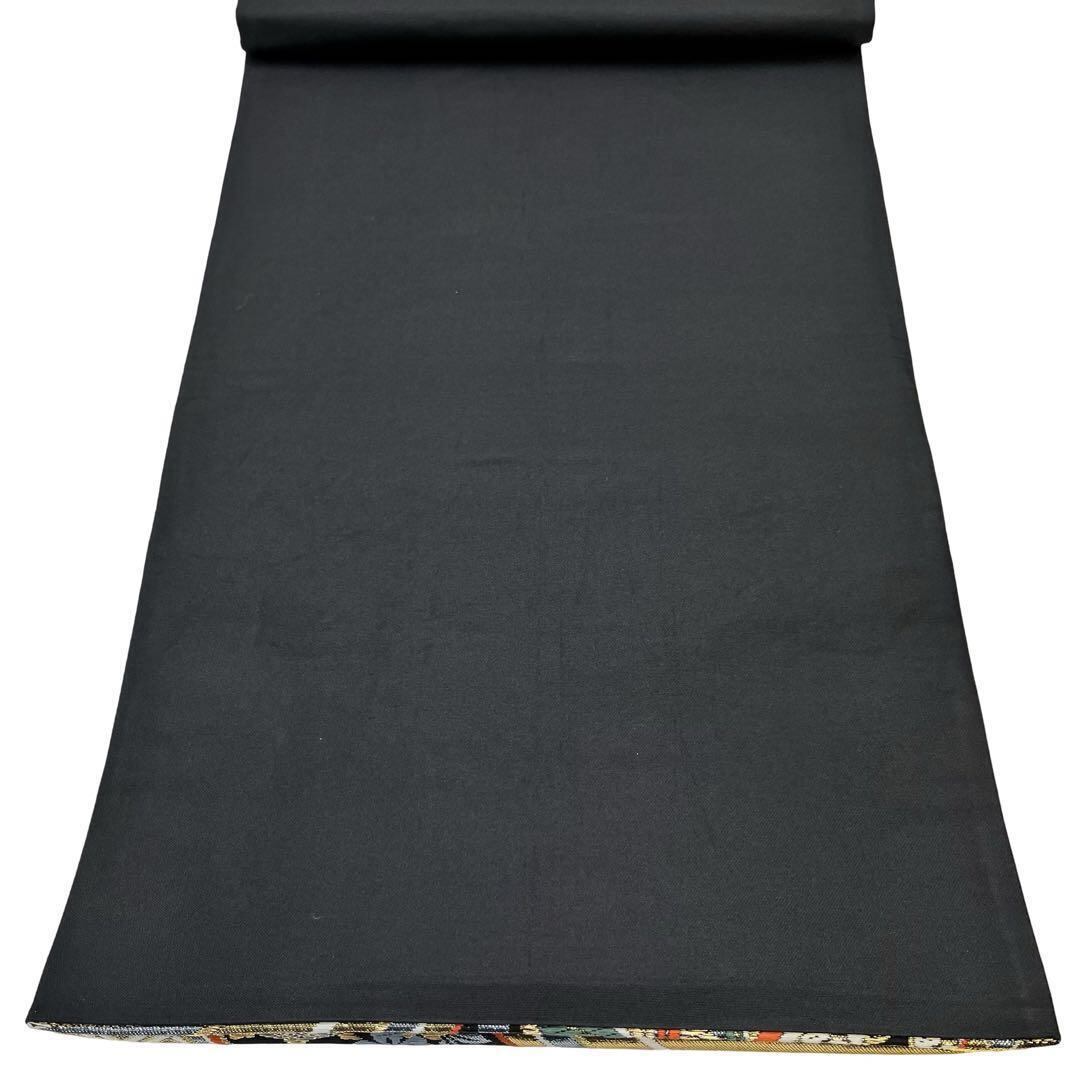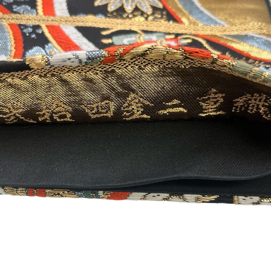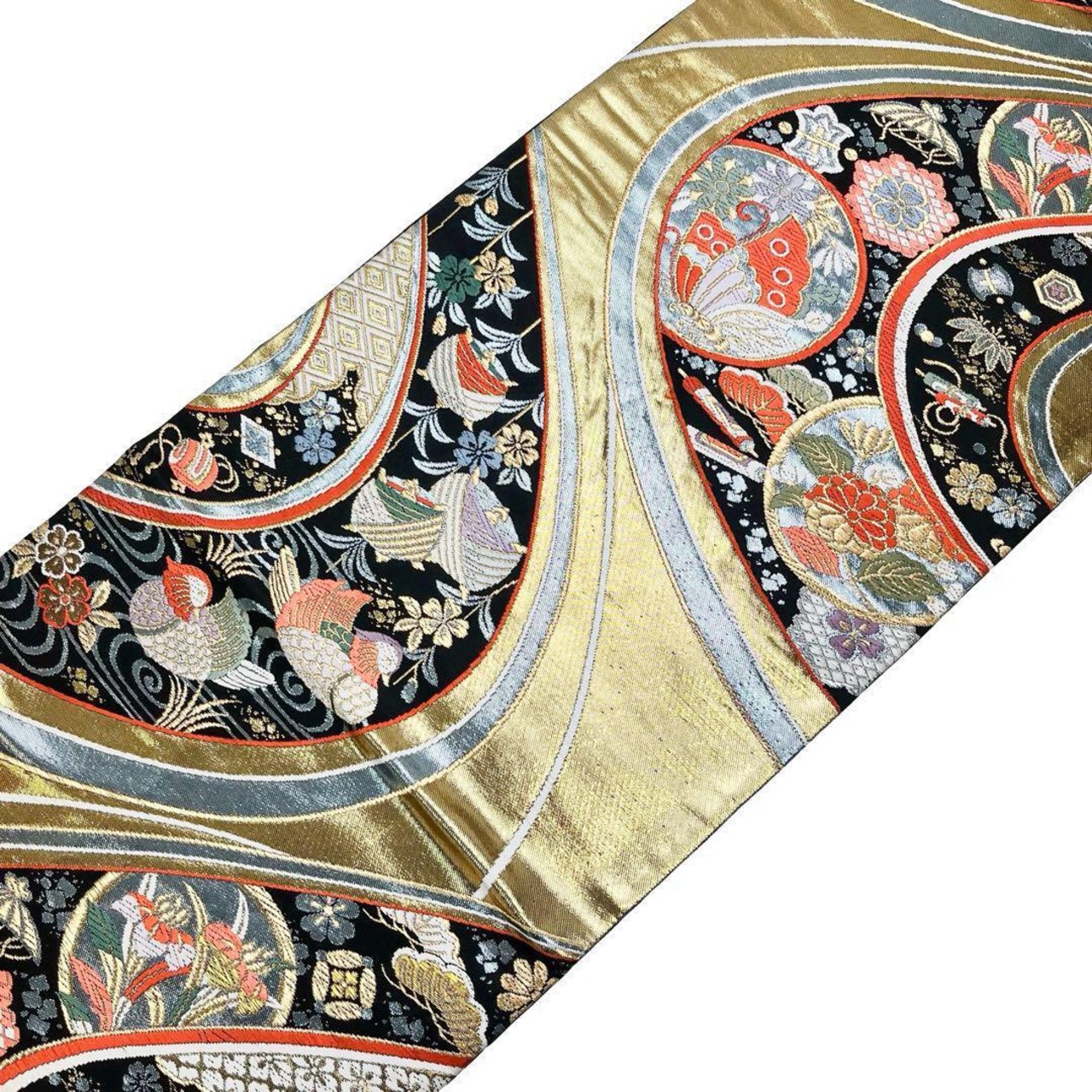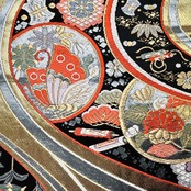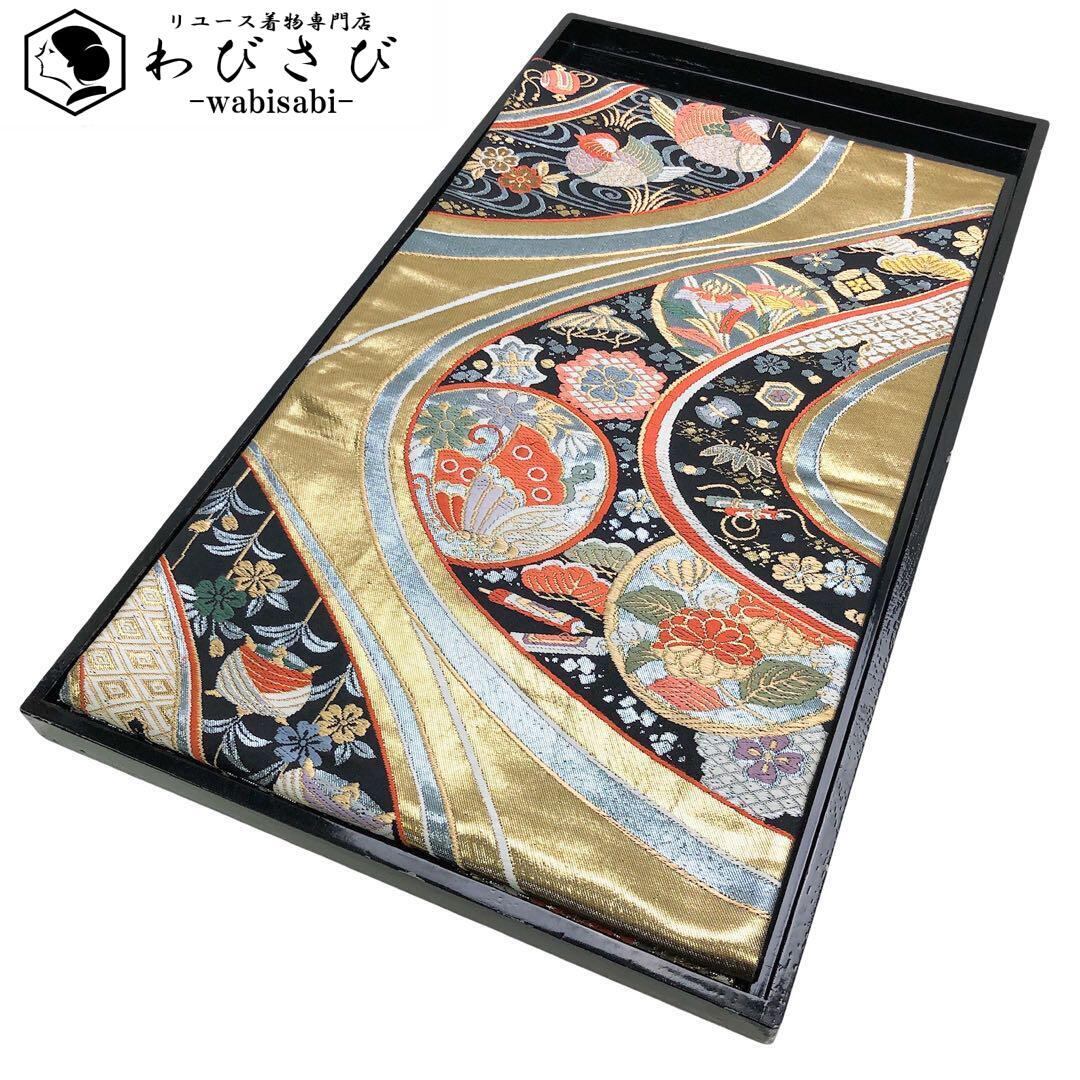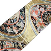 金色の煌びやかなお色味、流水模様に宝尽くしや丸に花や蝶の柄裄がデザインされた素敵なお品でございます。