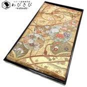 金色の煌びやかなお色味に丸に御所車、花模様などの柄裄がデザインされた素敵なお品でございます。