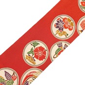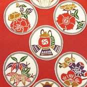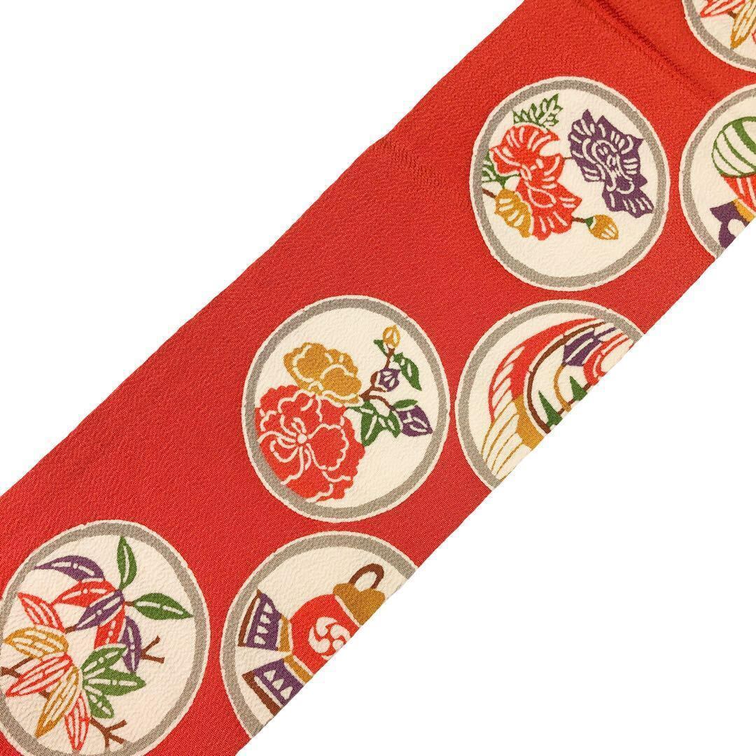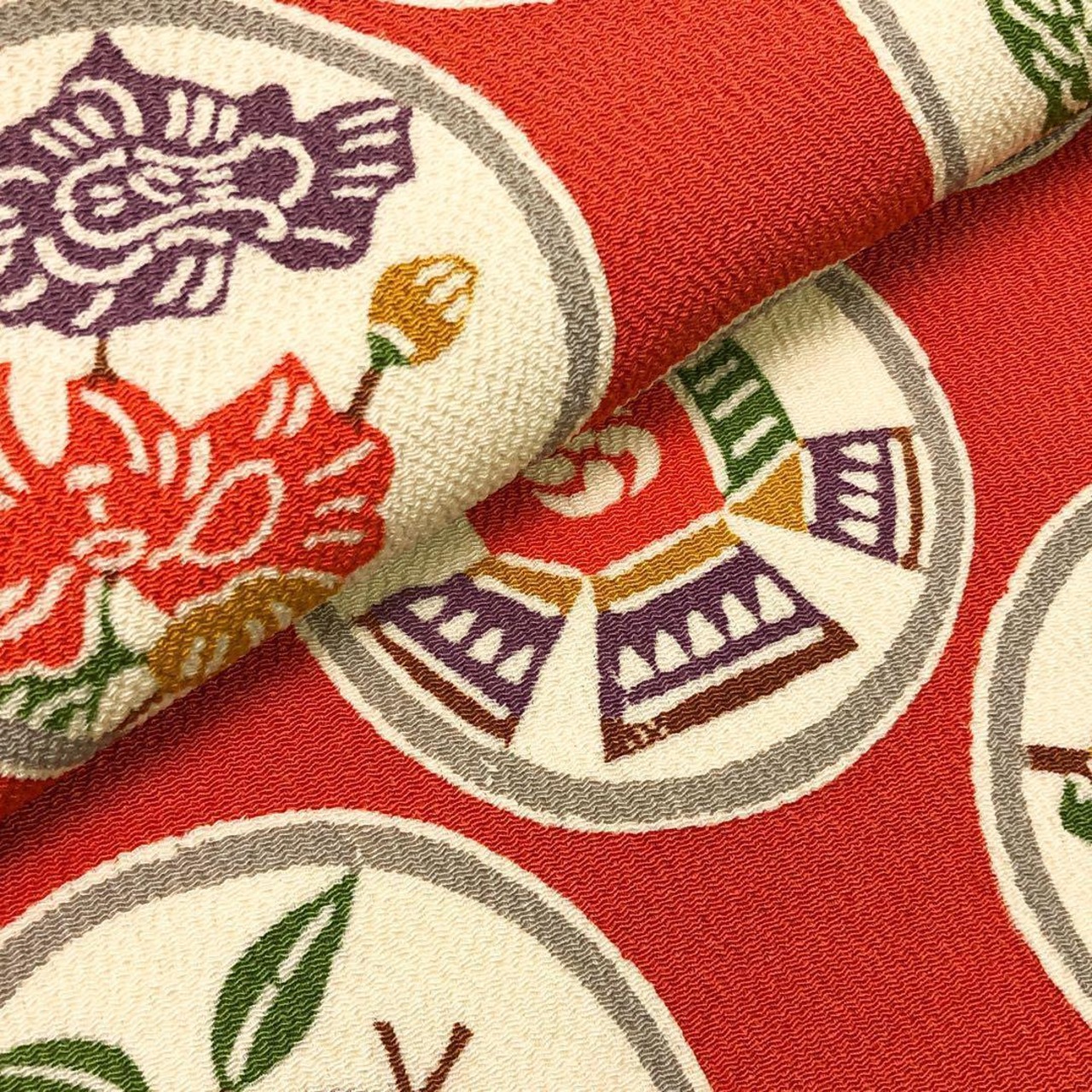 赤橙色のお色味の縮緬に丸に花模様や宝尽くしの柄裄がデザインされた素敵なお品でございます。