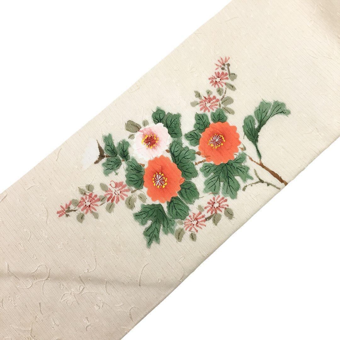 乳白色のお色味の髭紬に手描きの花柄模様の柄裄がデザインされた雰囲気の良い素敵なお品でございます。