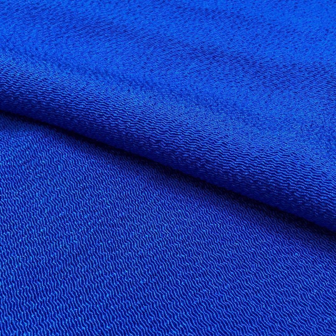 青色のお色味の縮緬、無地柄の素敵なお品でございます。
