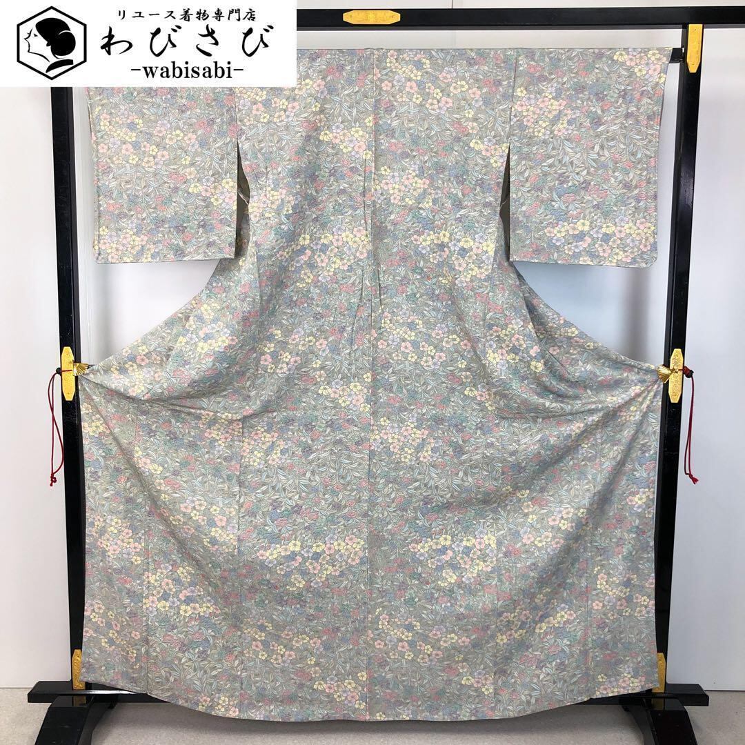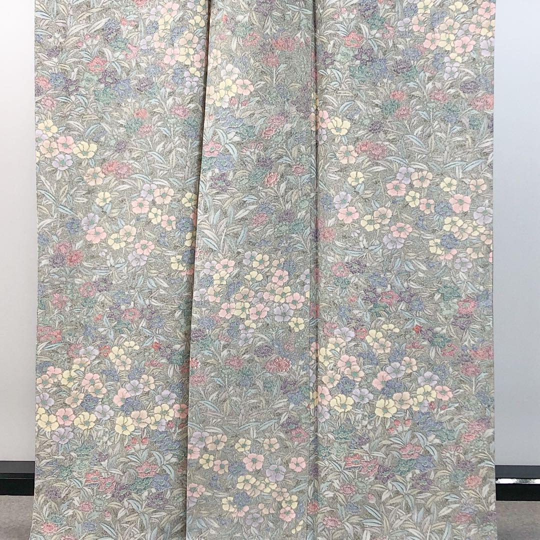 利休鼠色ベースのお色味に優しい色彩の花柄模様がデザインされた素敵な柄裄のお品でございます。