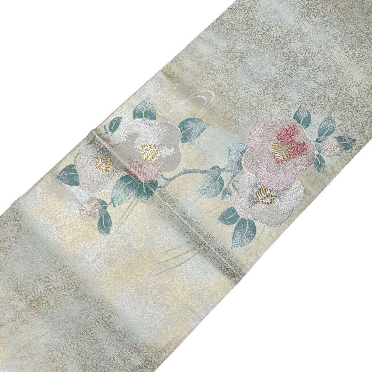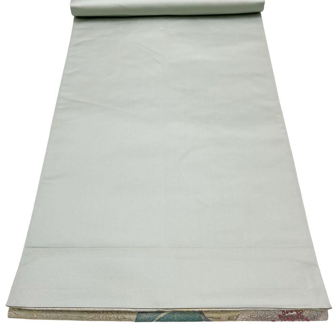 白緑色の上品なお色味に美しい春椿の柄裄がデザインされた素敵なお品でございます。
