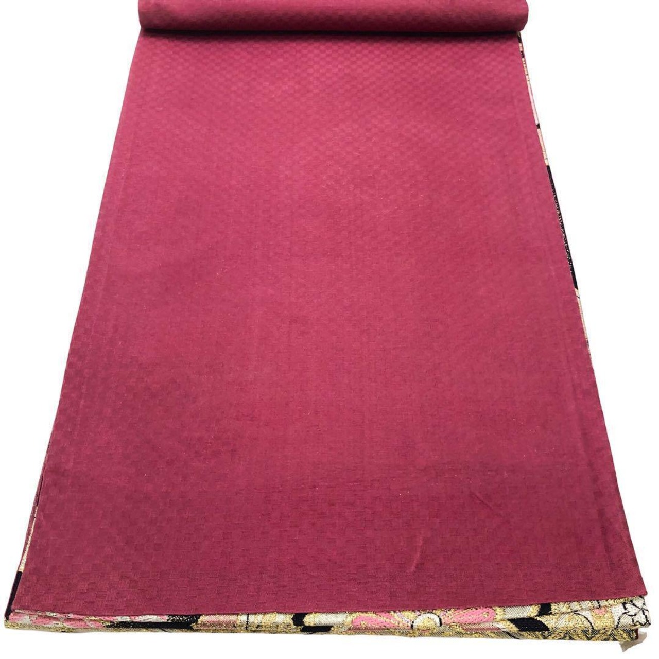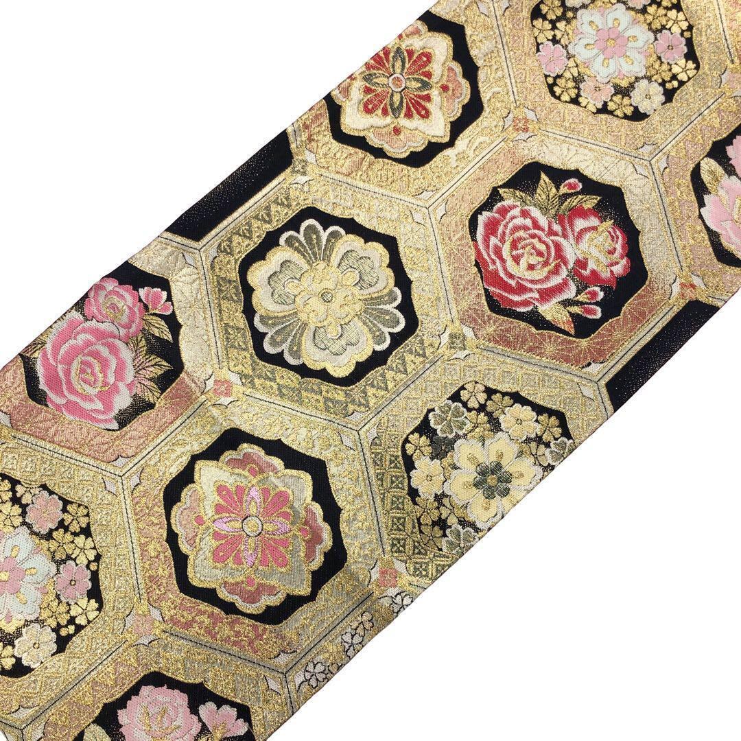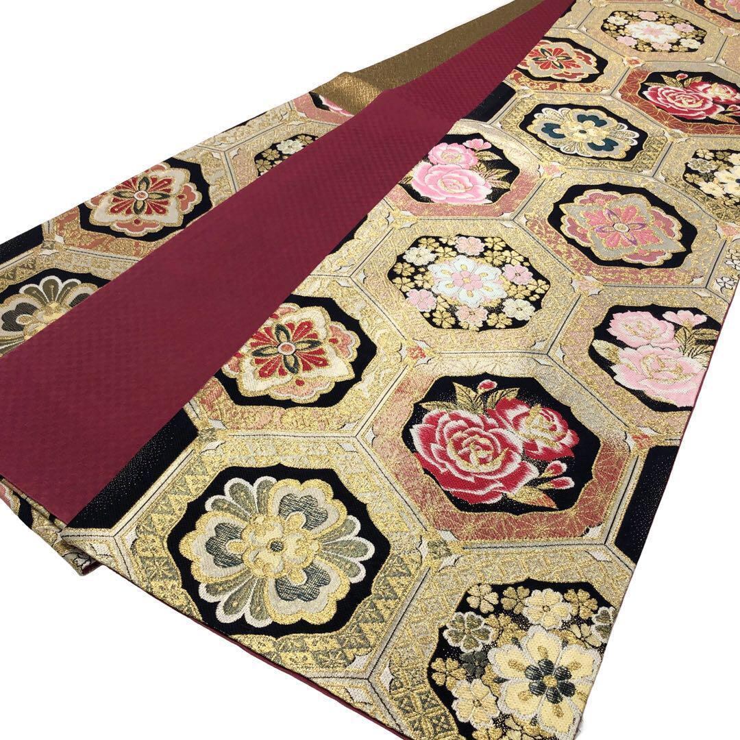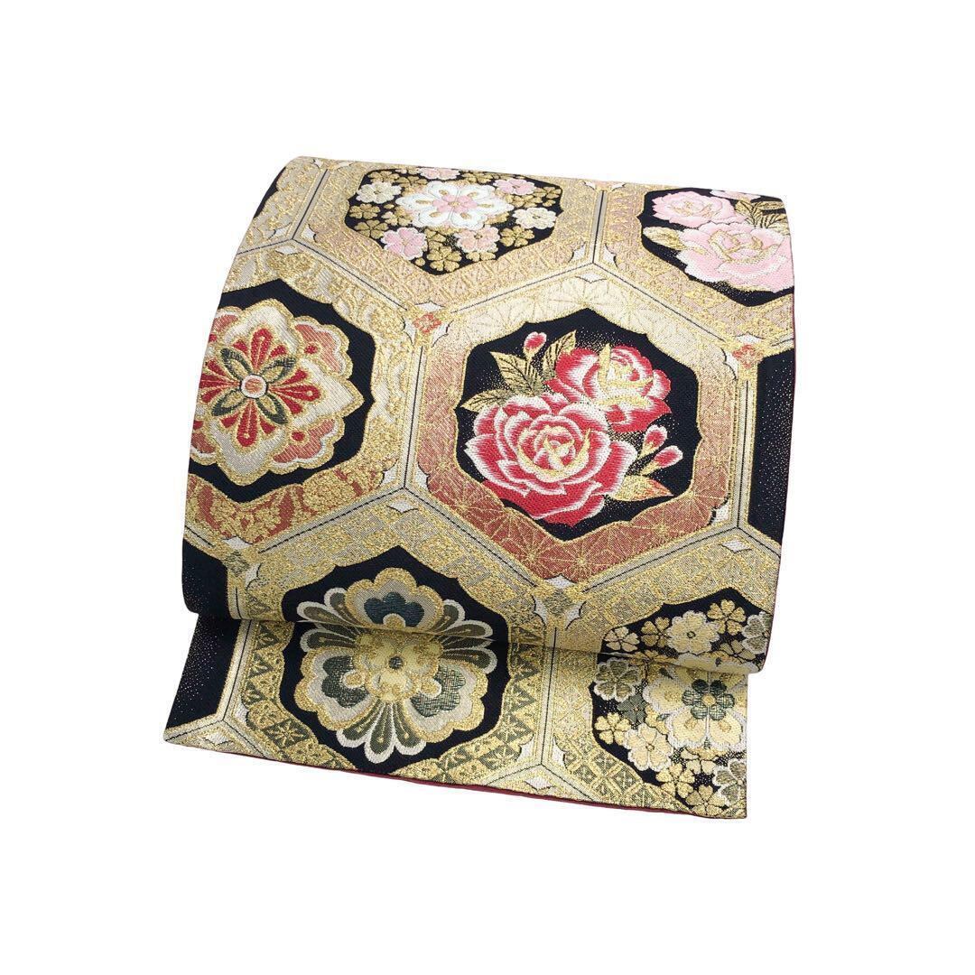 金色ベースのお色味、亀甲に美しい花柄模様の柄裄がデザインされた素敵なお品でございます。