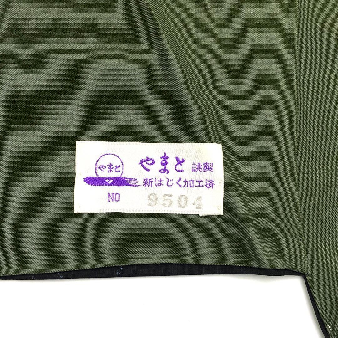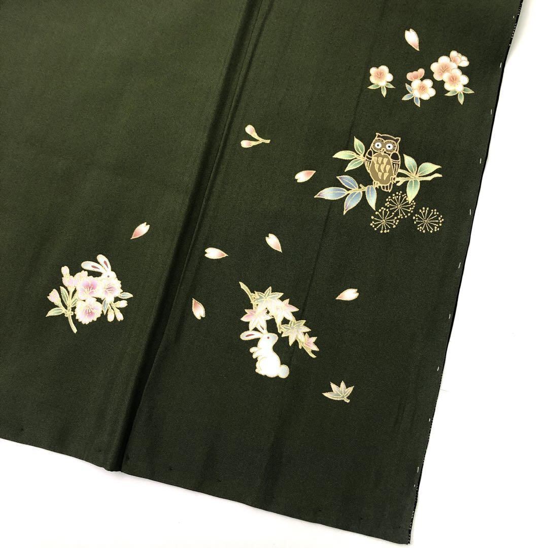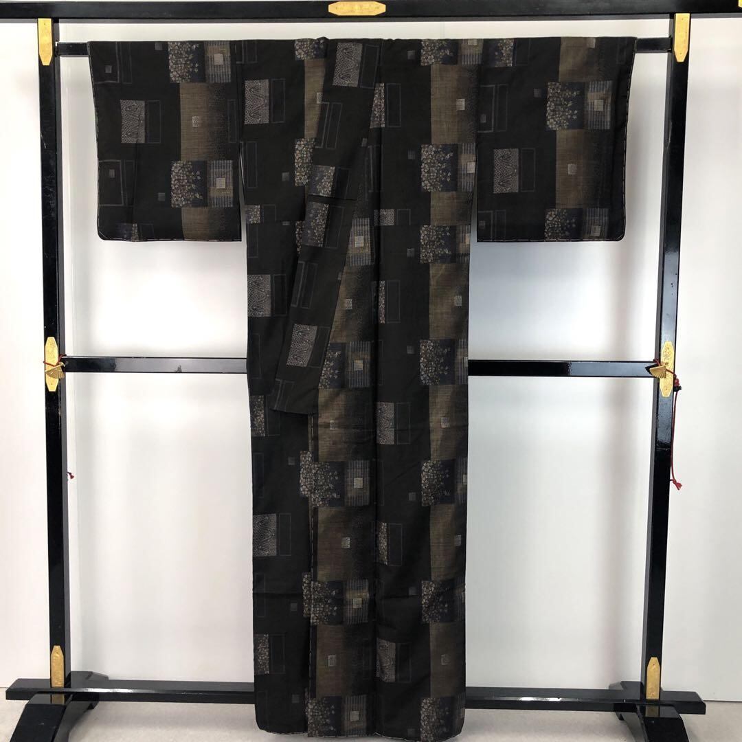 黒色ベースの雰囲気の良い泥染、四角に花模様、八掛には木兎に兎がデザインされた素敵な柄裄のお品でございます。