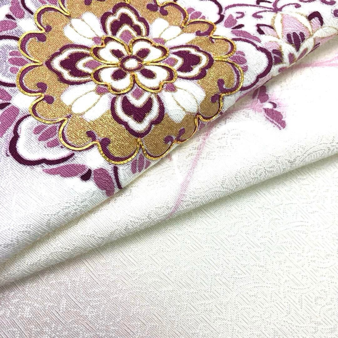 乳白色のお色味に紫色の暈し、一部金駒刺繍の美しい華柄模様、花唐草がデザインされた上品な柄裄の素敵なお品でございます。