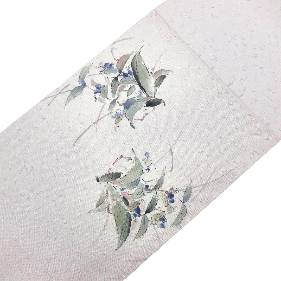 名古屋帯 髭紬 作家物 手描き 草花模様 白梅鼠色 O-4827 着物 きもの kimono 和服 和装 中古 リサイクル着物 【送料無料】