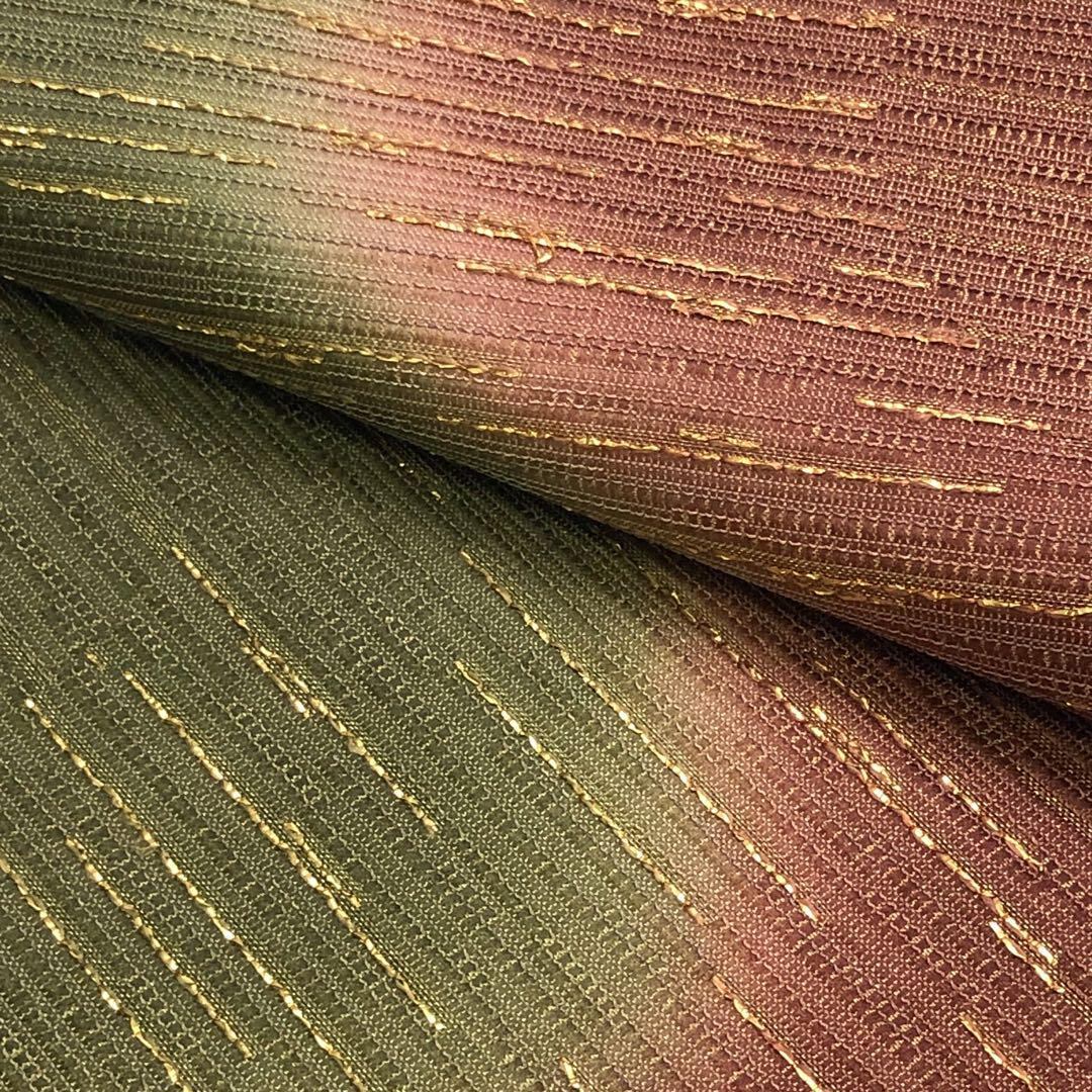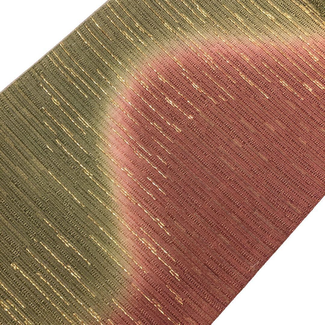 柳茶色ベースのお色味の美しい染め分け、暈し、横糸に金糸が使われたデザインの雰囲気の良い素敵なお品でございます。