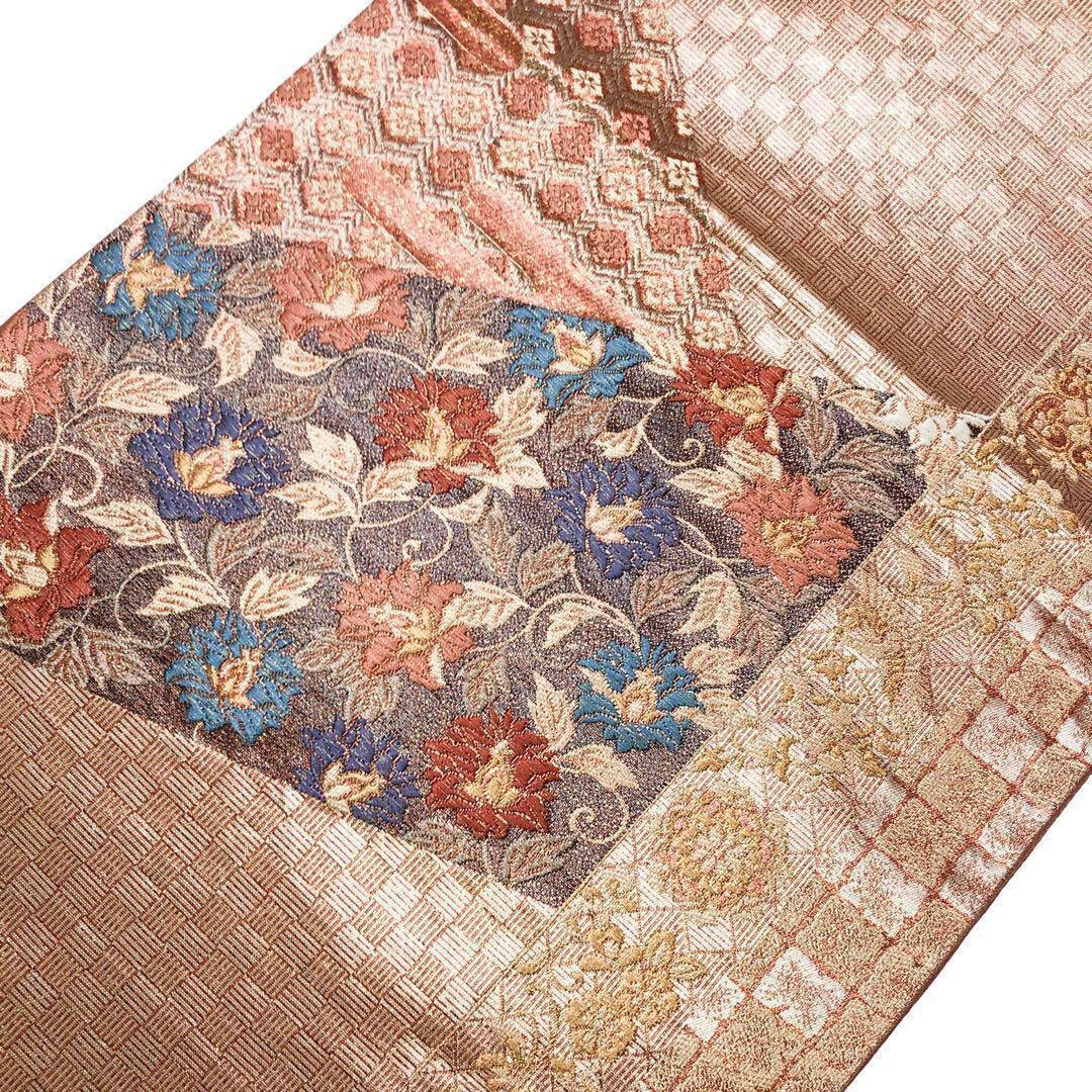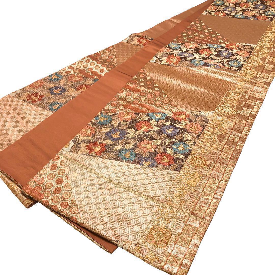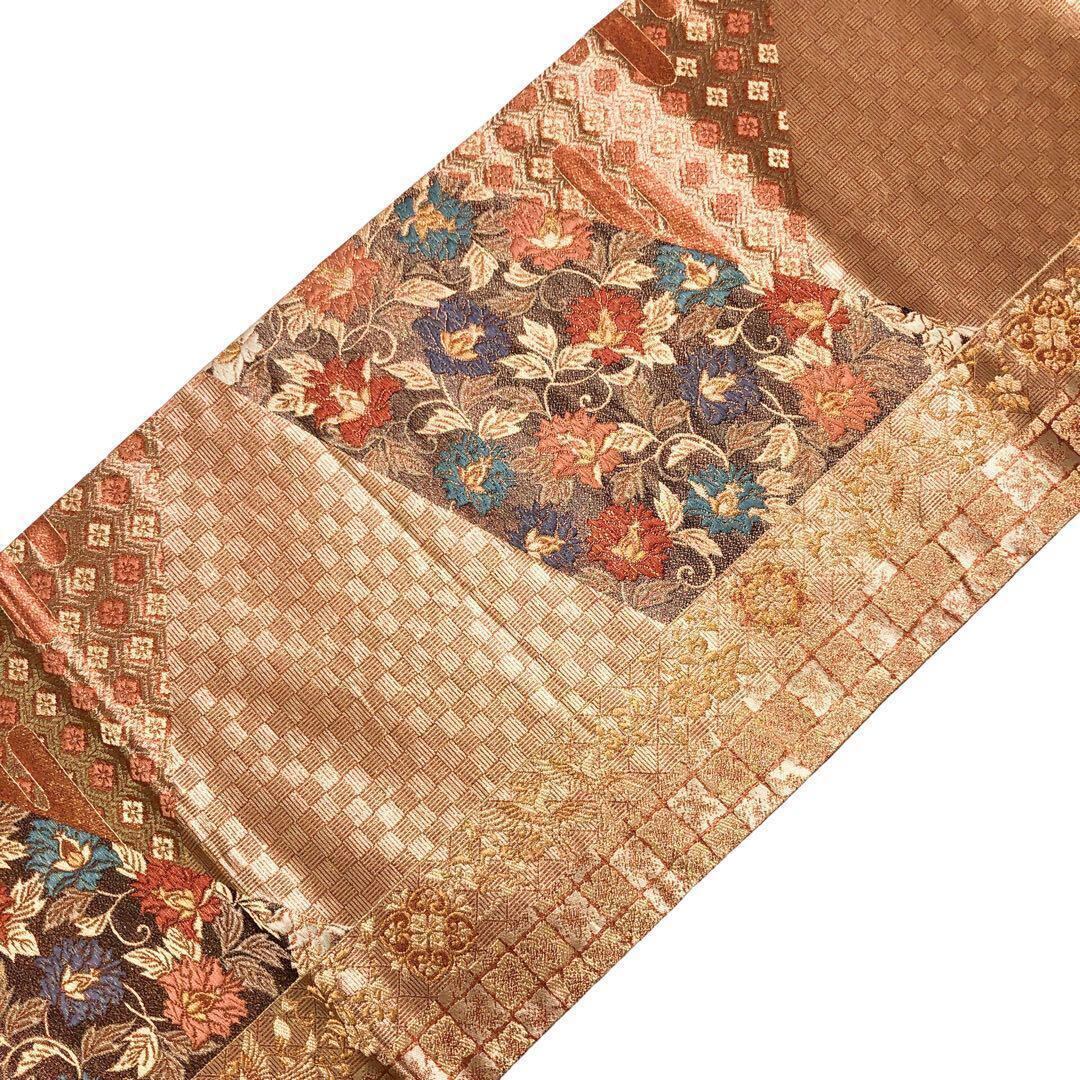 照柿色ベースの煌びやかなお色味に花唐草模様、市松模様などの柄裄がデザインされた素敵なお品でございます。