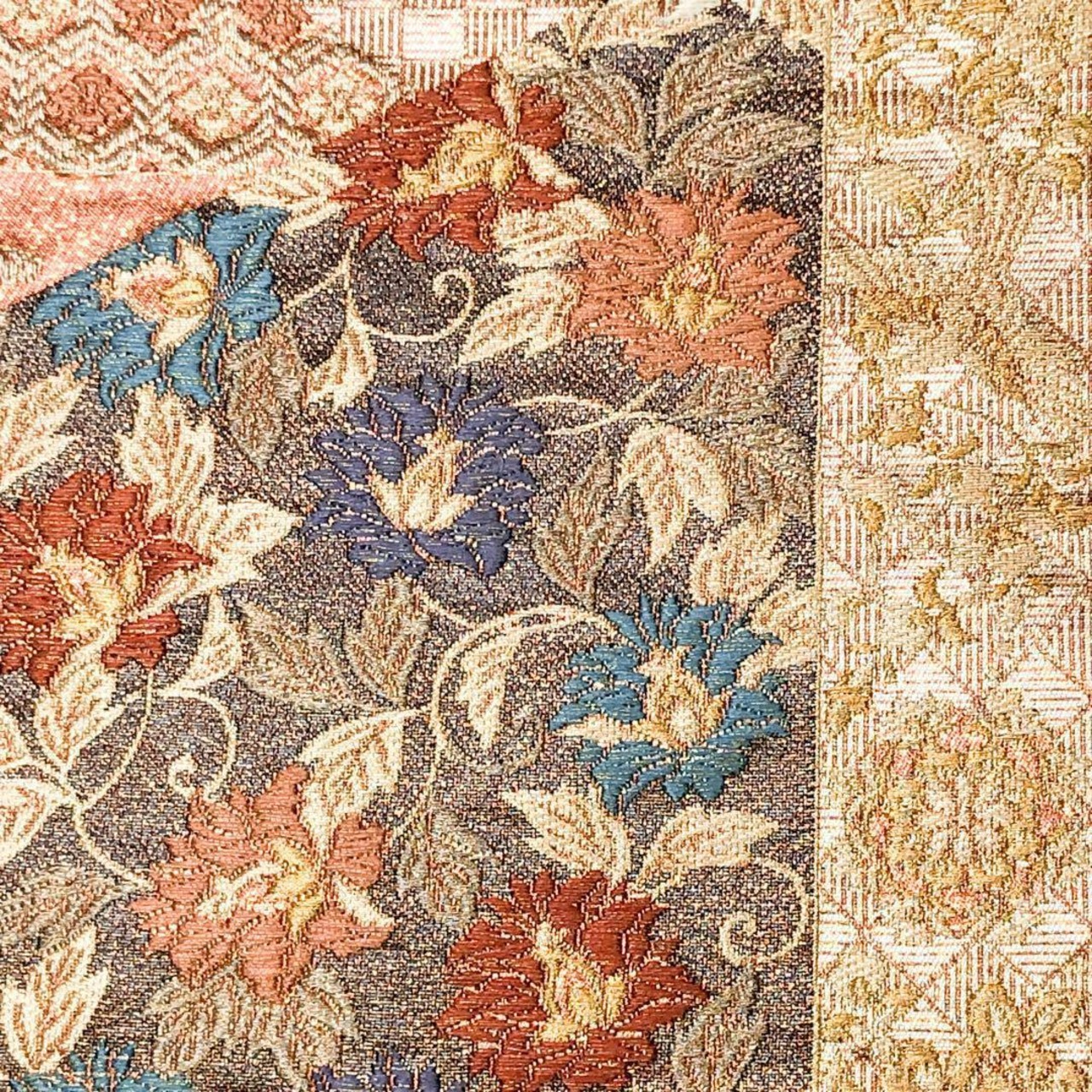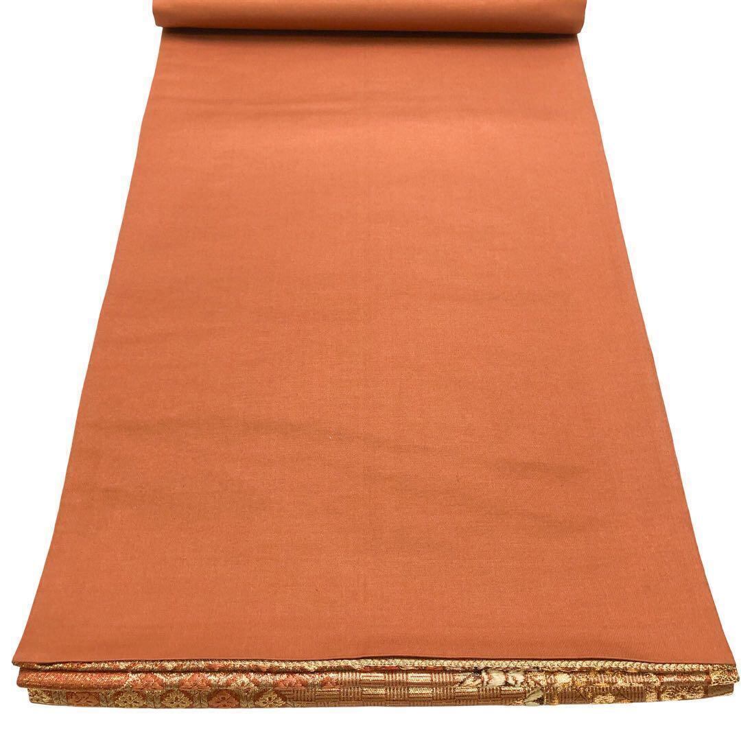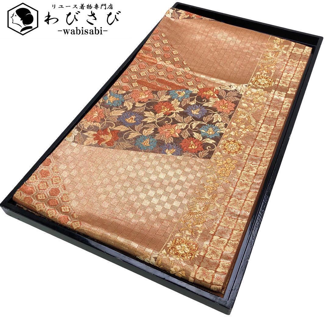 照柿色ベースの煌びやかなお色味に花唐草模様、市松模様などの柄裄がデザインされた素敵なお品でございます。