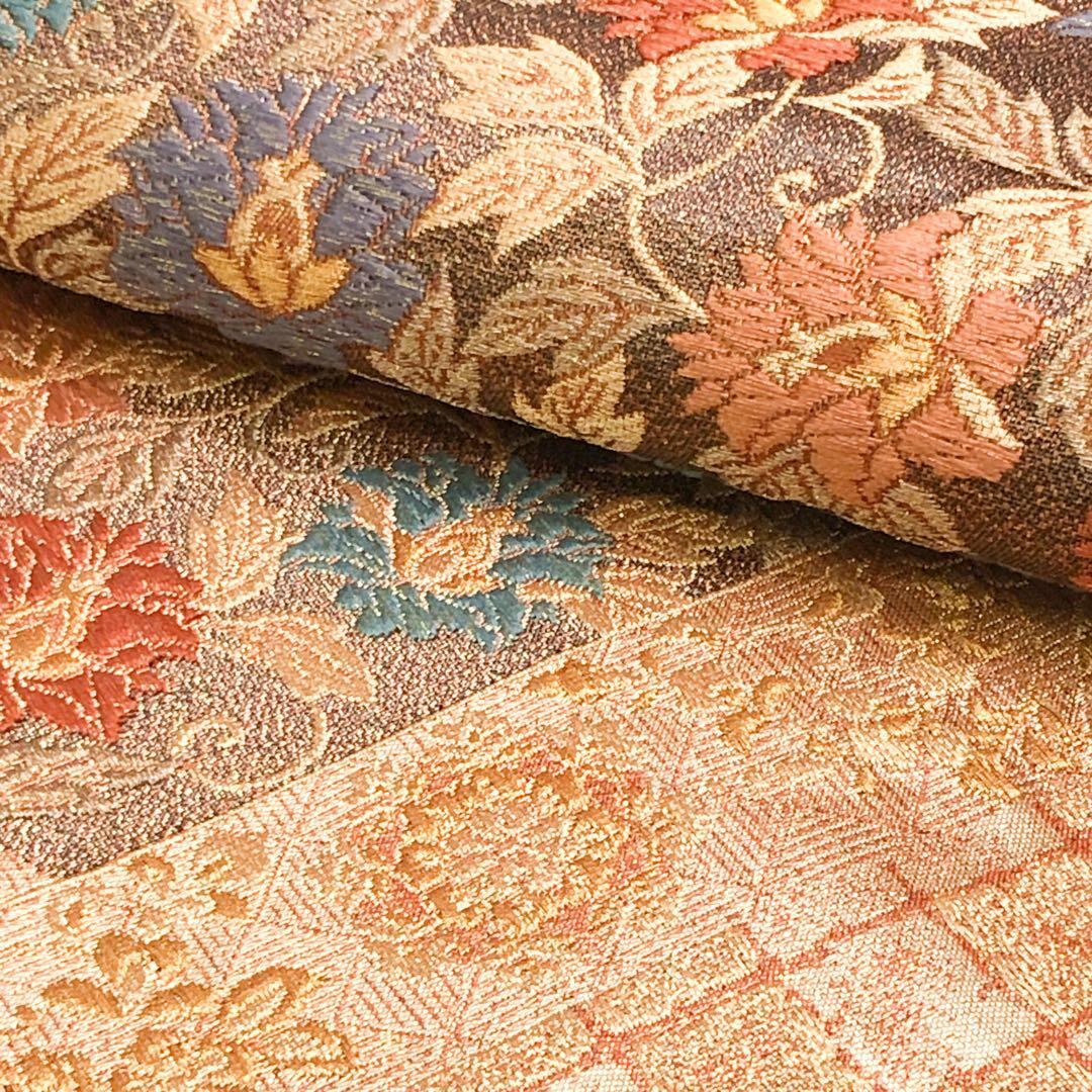 袋帯 花唐草模様 市松模様 金糸 照柿色 O-4834 着物 きもの kimono 和服 和装 中古 リサイクル着物 【送料無料】