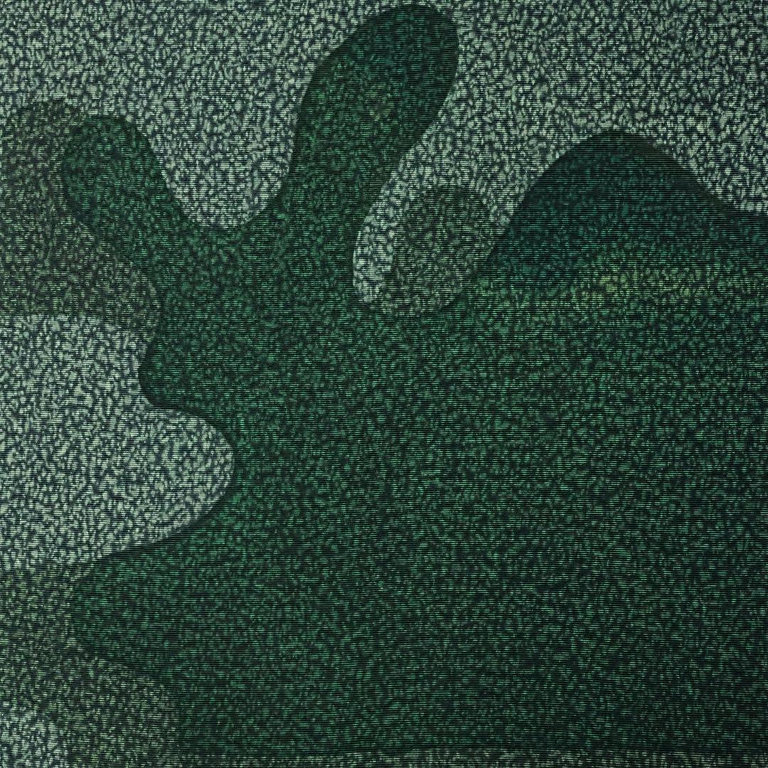 老緑色の落ち着いた緑味のお色に叩き染、抽象柄の染模様がデザインされた素敵なお品でございます。