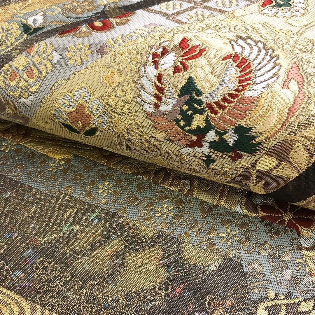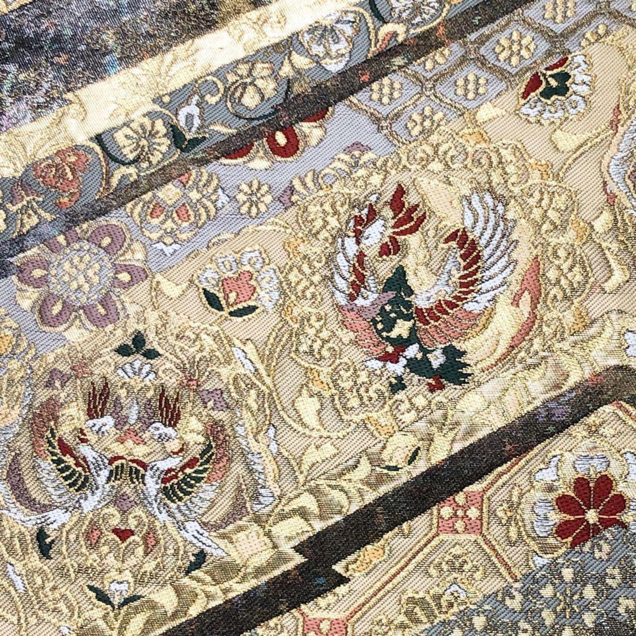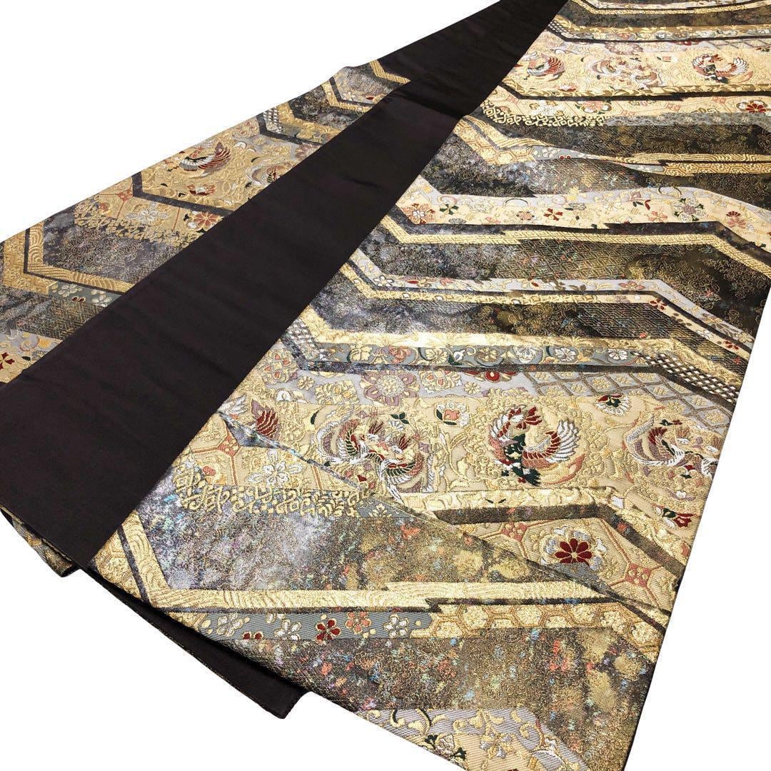 手織引箔、金色ベースのお色味に華柄模様、鳳凰などの柄裄がデザインされた素敵なお品でございます。
