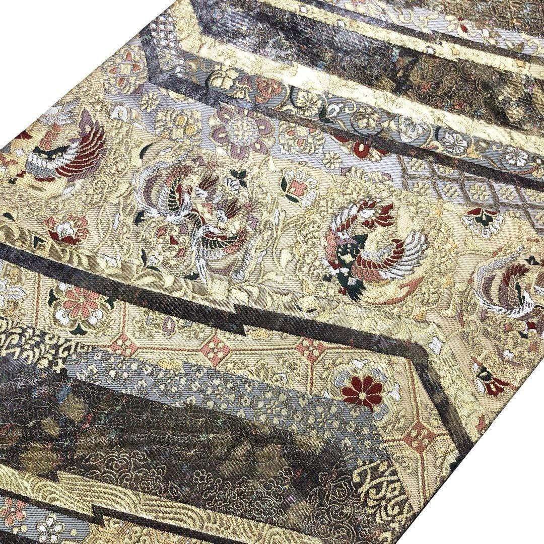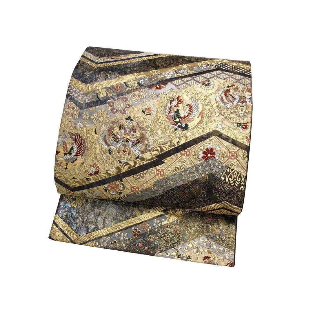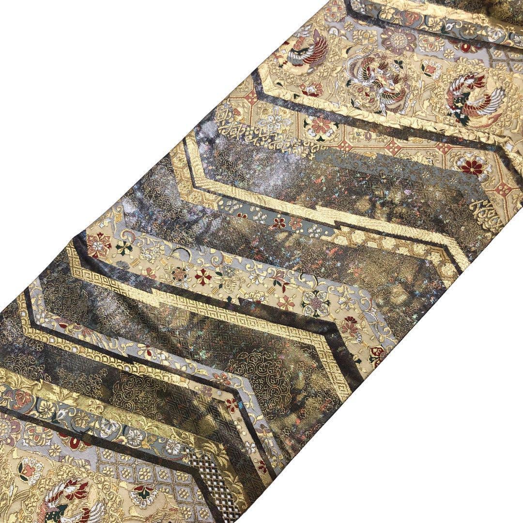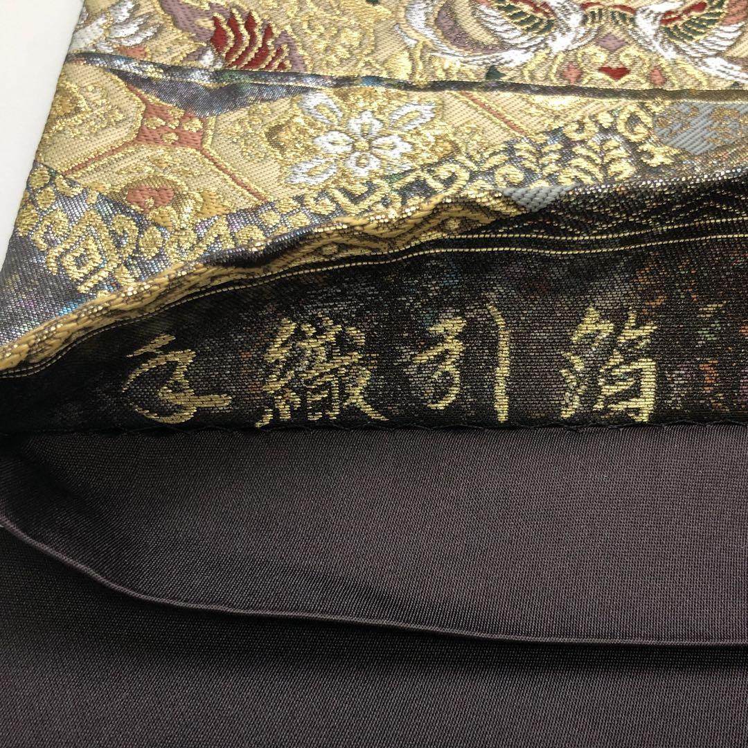 手織引箔、金色ベースのお色味に華柄模様、鳳凰などの柄裄がデザインされた素敵なお品でございます。