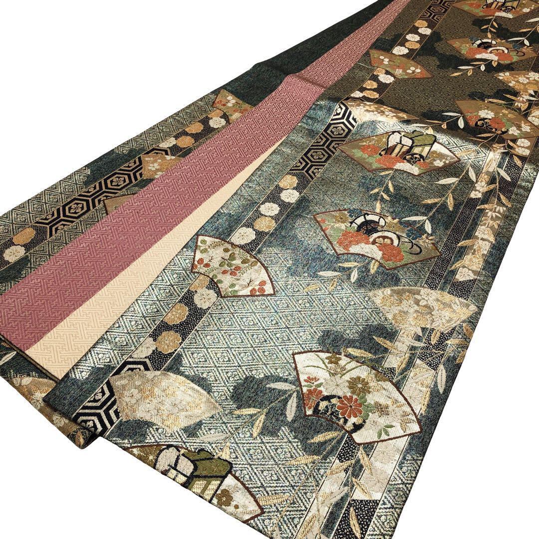 碧色ベースの煌びやかなお色味、地紙に花模様、鼓、御所車などの柄裄がデザインされた素敵なお品でございます。