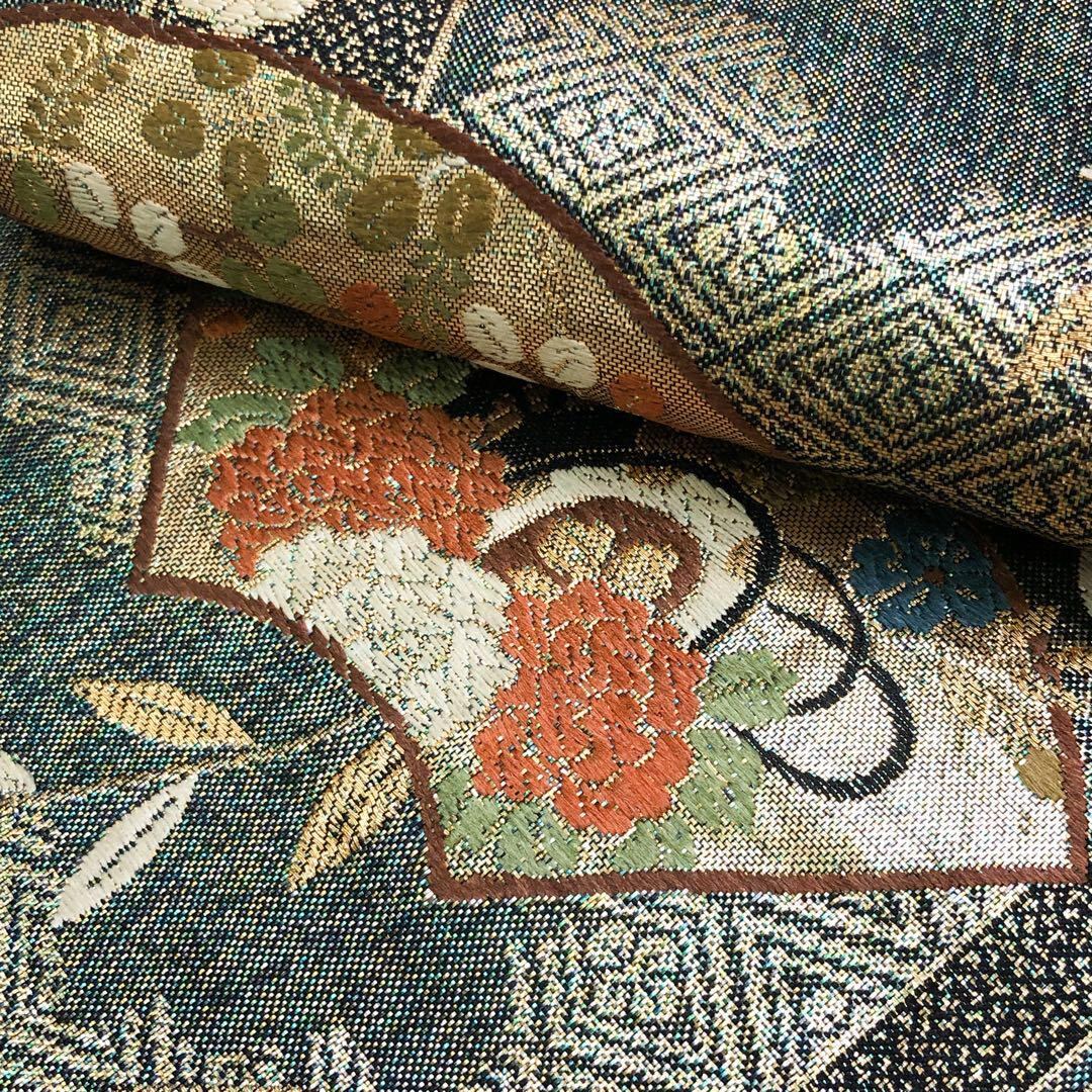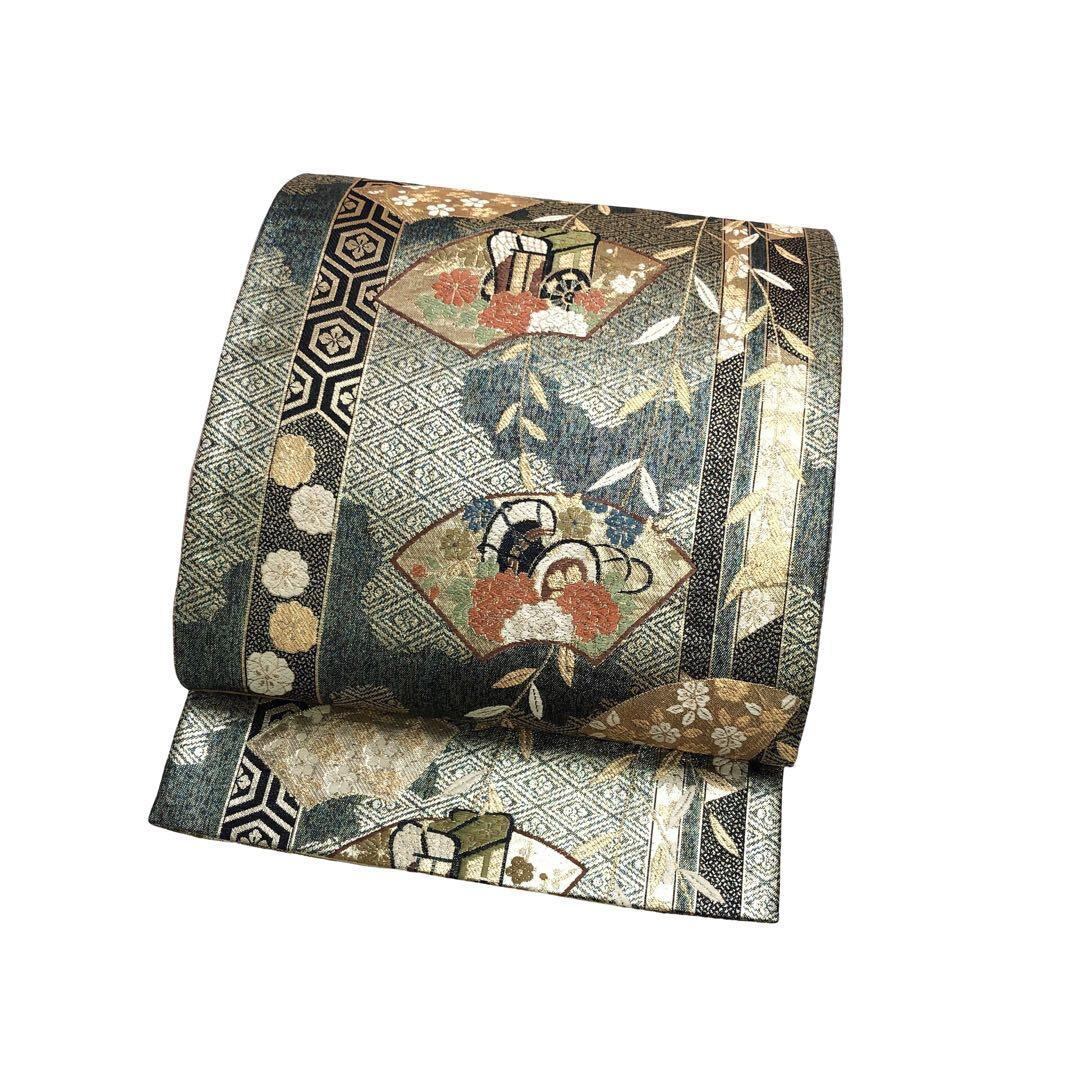 袋帯 慶長華小袖 地紙に花模様 御所車 鼓 碧色 金糸 O-4826 着物 きもの kimono 和服 和装 中古 リサイクル着物 【送料無料】
