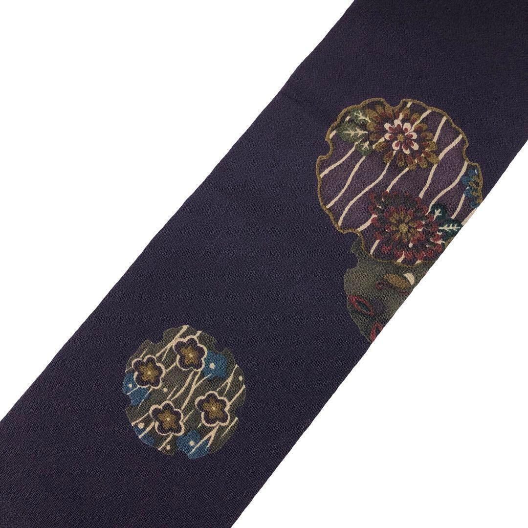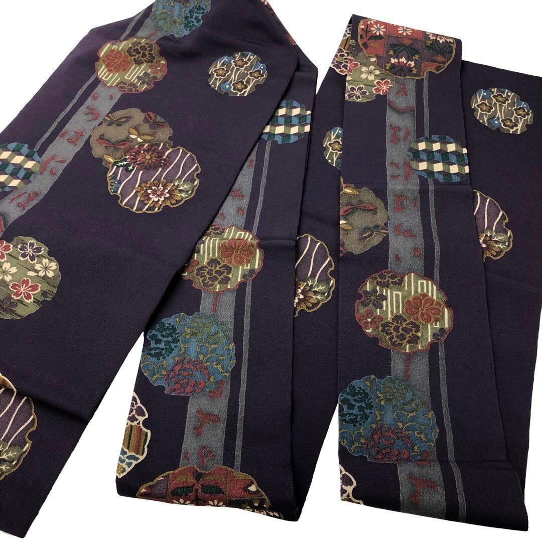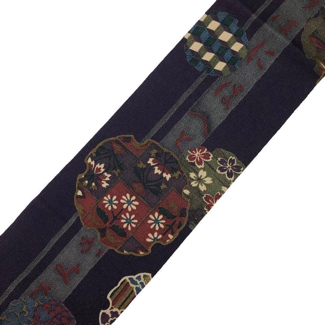紫黒色の濃い目の紫のお色味の縮緬地、雪輪に花模様、縦柄のいろは歌がデザインされた雰囲気の良い素敵な柄裄のお品でございます。
