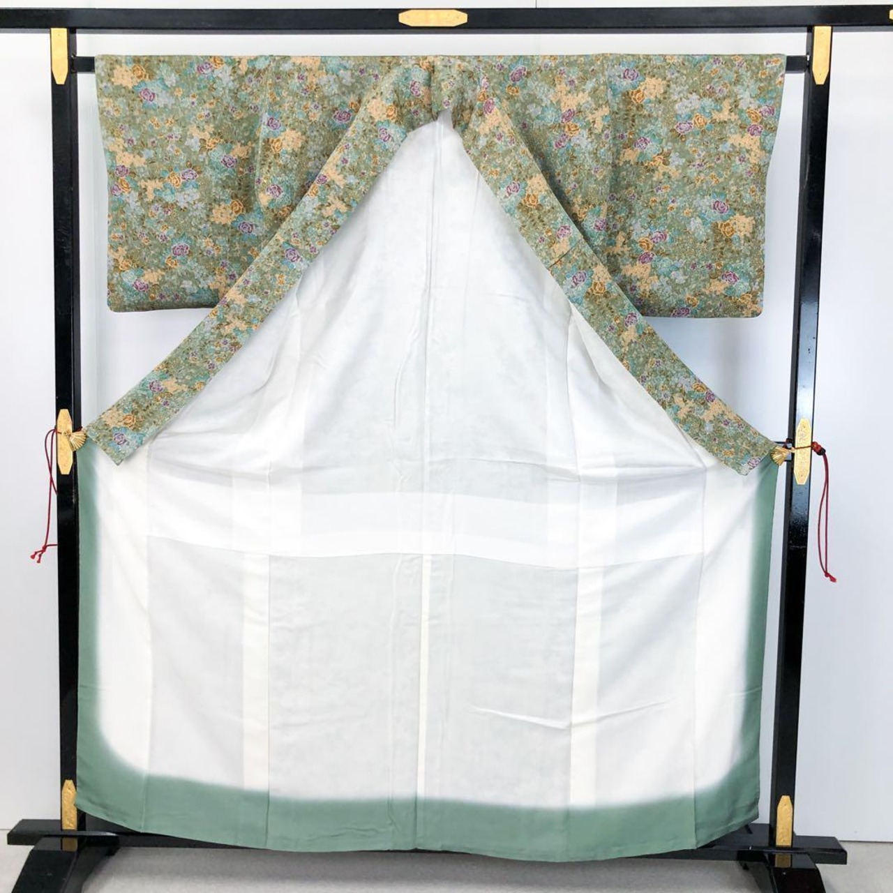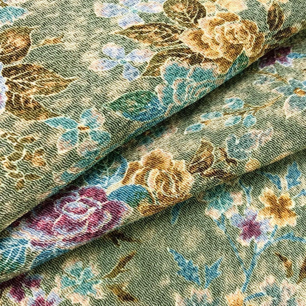 豆青色の優しいお色味の縮緬に色鮮やかな美しい薔薇の花模様の染柄がデザインされた素敵なお品でございます。