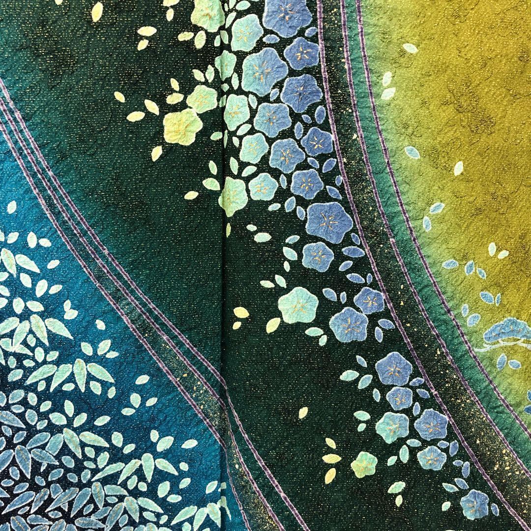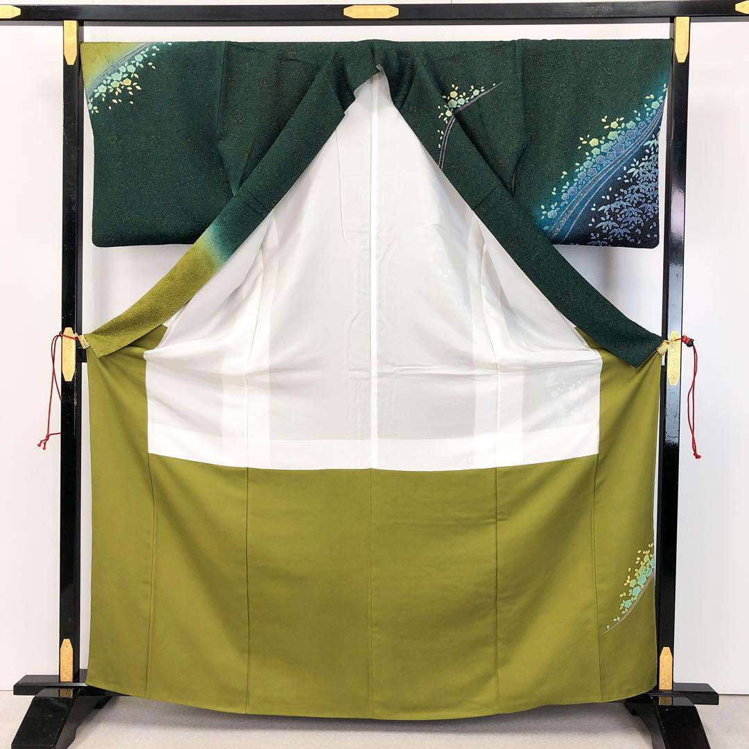黄草色ベースの美しいグラデーションのお色味に金通し、流れる様な松竹梅の柄裄がデザインされた素敵なお品でございます。