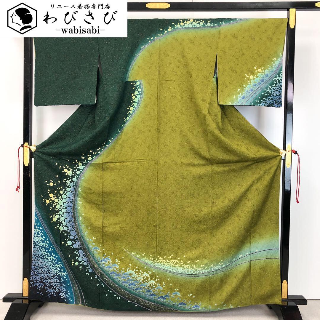 訪問着 美しいグラデーション 松竹梅 金通し 黄草色 トールサイズ K-4475 着物 きもの kimono 和服 和装 中古 リサイクル着物 【送料無料】