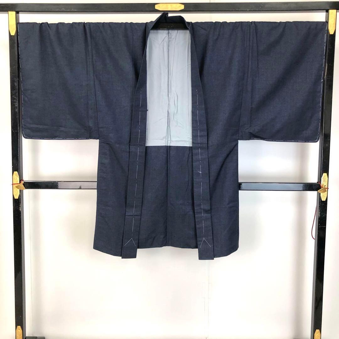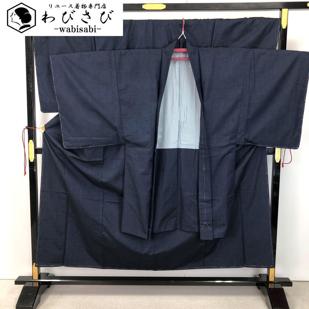 男着物 アンサンブル 紬 濃藍色 キングサイズ しつけ糸 M-1104 着物 きもの kimono 和服 和装 中古 リサイクル着物 【送料無料】