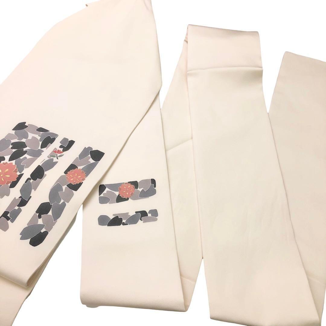 乳白色の上品なお色味に一部刺繍が使われた桜の花、花弁模様の柄裄がデザインされた素敵なお品でございます。