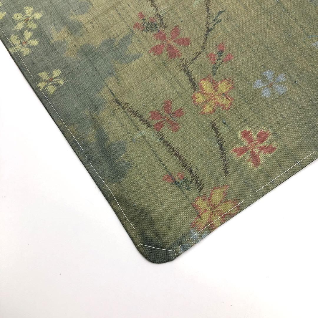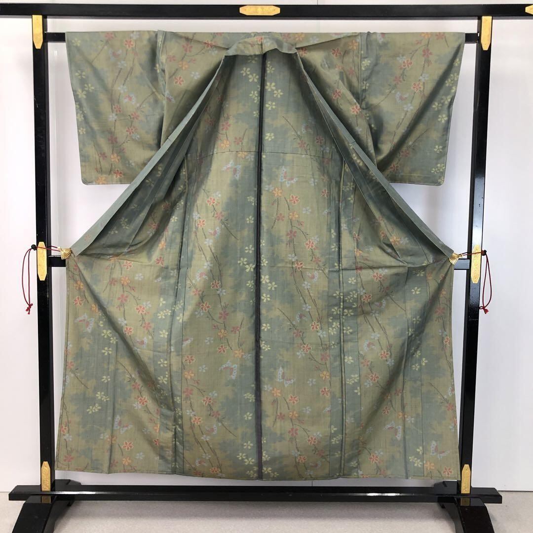 単衣 紬 蝶々に花模様 絣柄 利休色 しつけ糸 K-4485 着物 きもの kimono 和服 和装 中古 リサイクル着物 【送料無料】