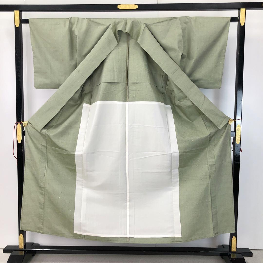 単衣 紬 縦縞模様 無地 灰緑色 K-4486 着物 きもの kimono 和服 和装 中古 リサイクル着物 【送料無料】