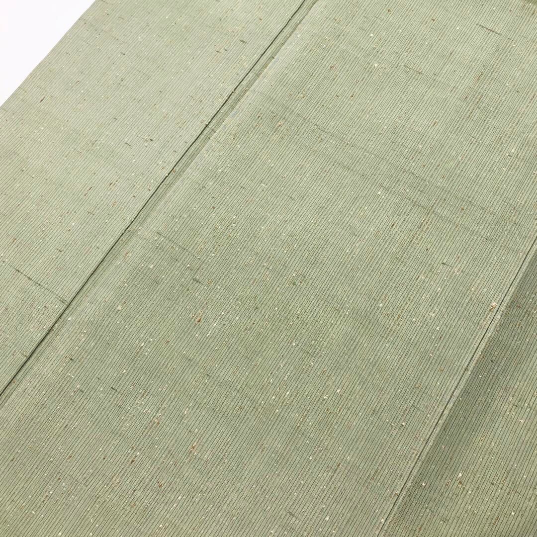 灰緑色の落ち着きのあるお色の紬地、無地の縦縞模様、紬の節が雰囲気の良い素敵なお品でございます。
