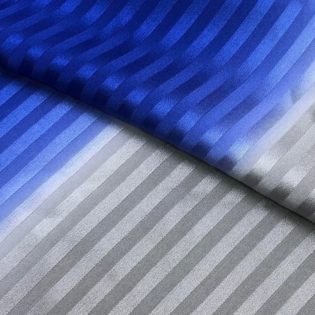 青色と灰色のお色味の染め分けに縦縞模様がデザインされた品のある素敵な柄裄のお品でございます。