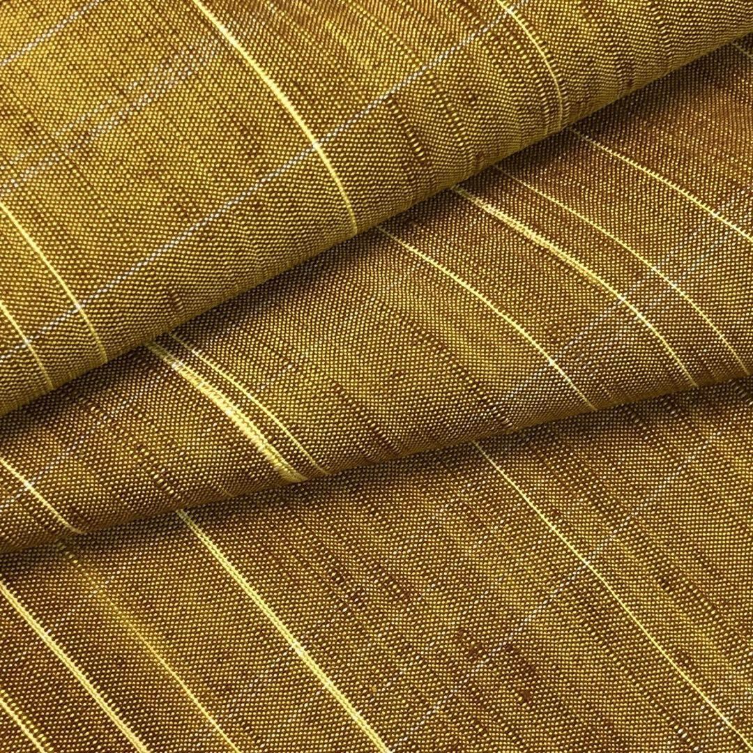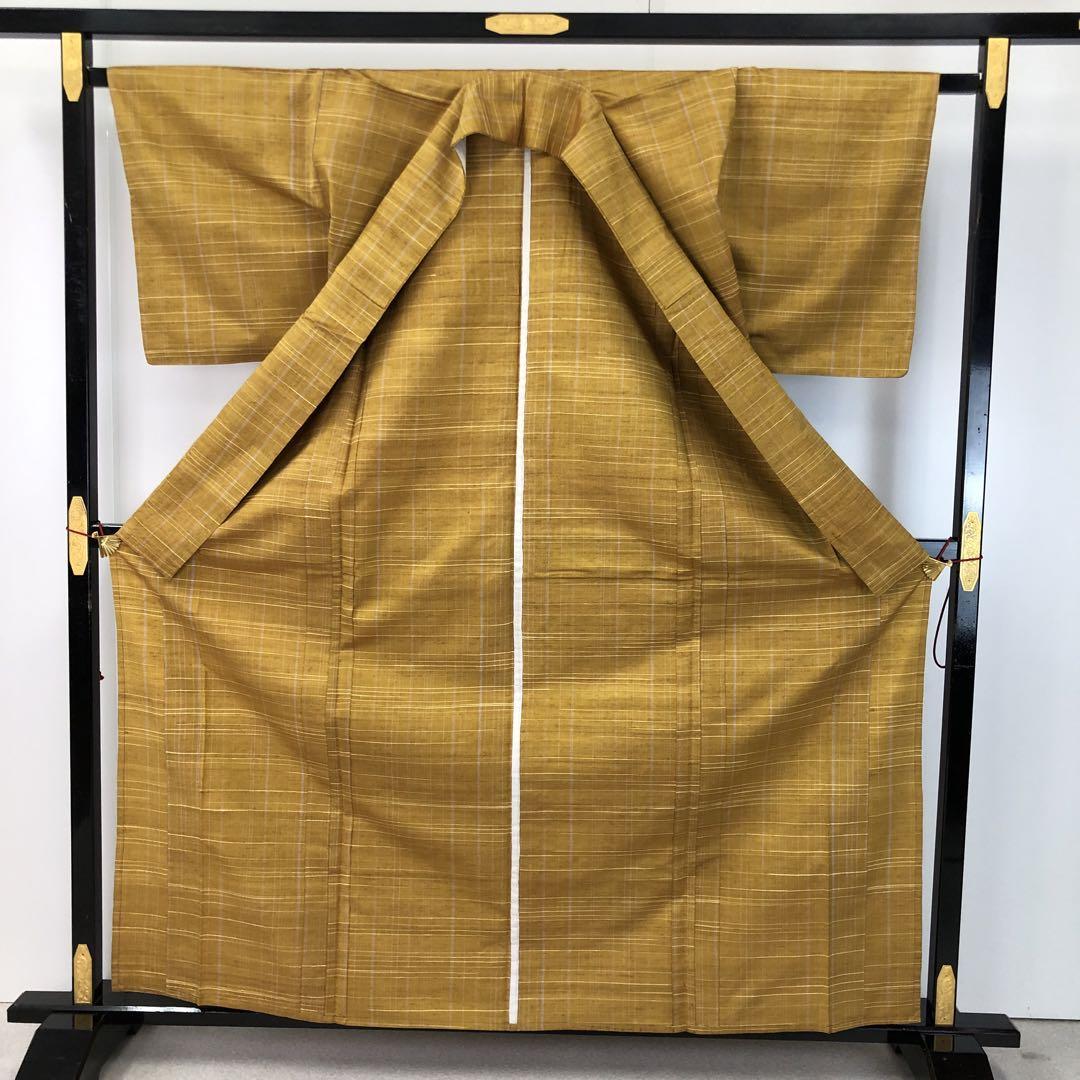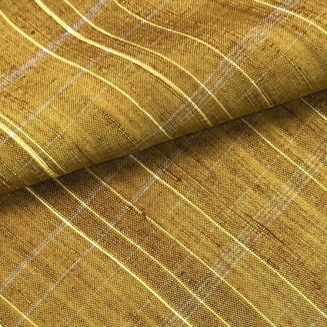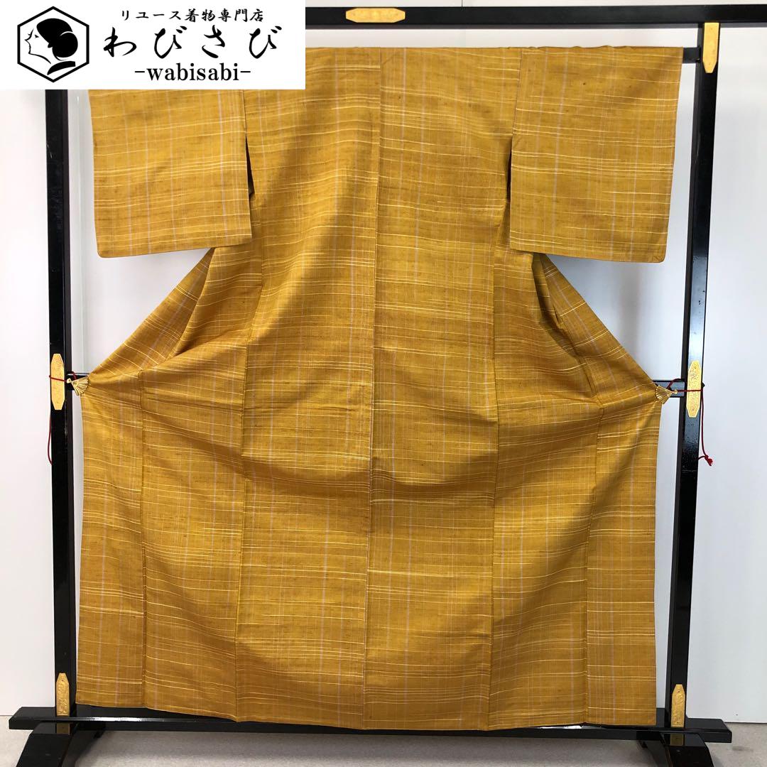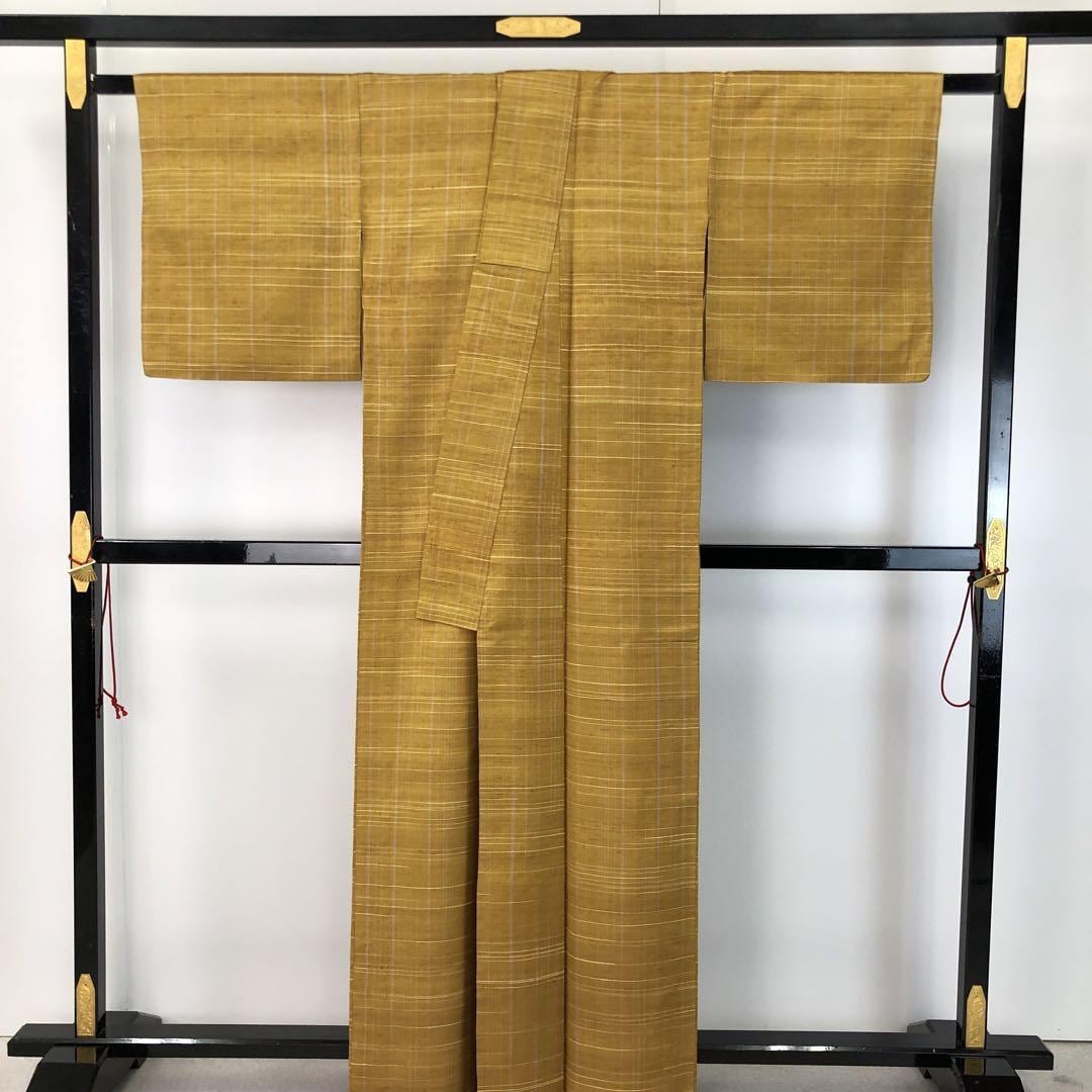 黄土色のお色味の紬地、雰囲気の良い縦横縞の織模様がデザインされた素敵な柄裄のお品でございます。