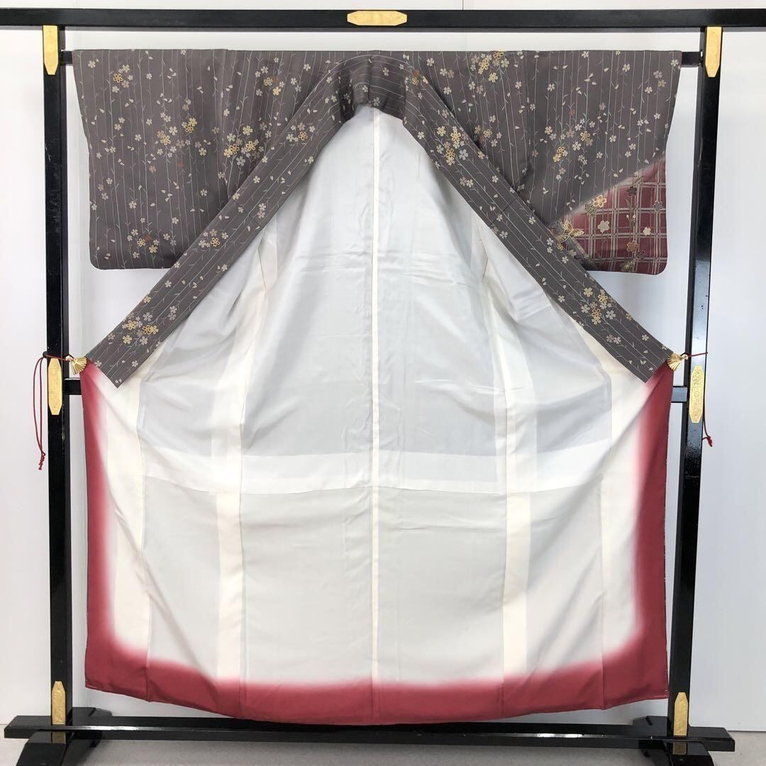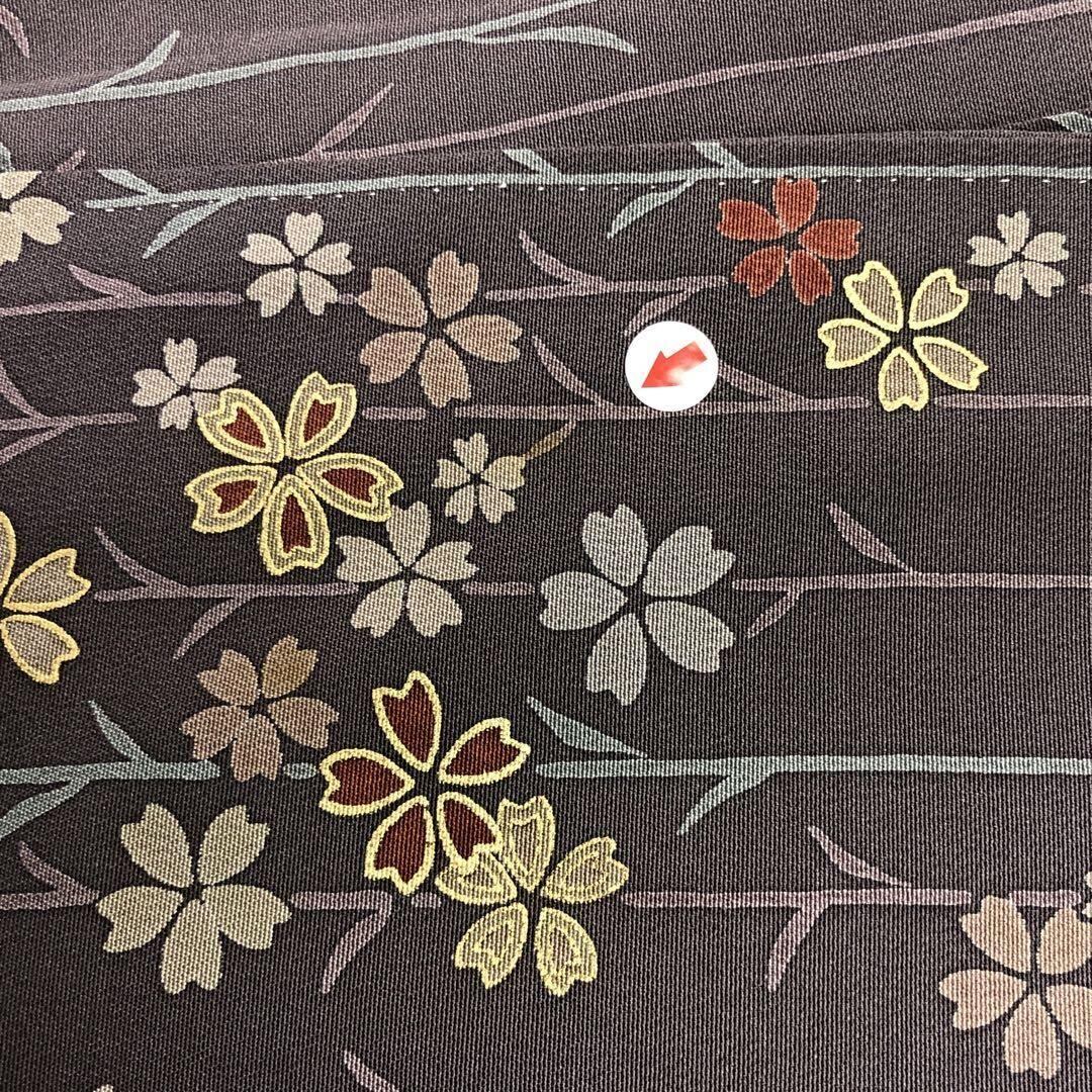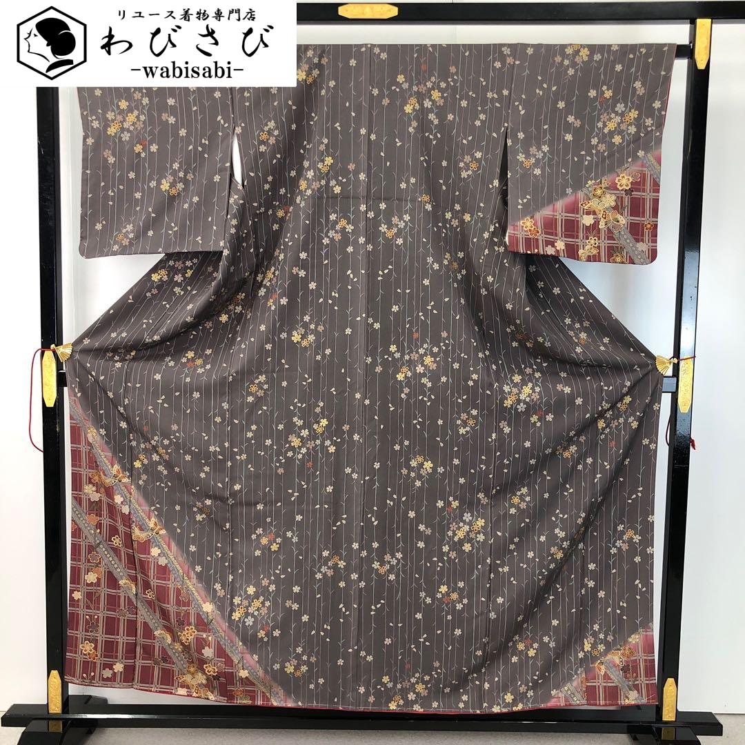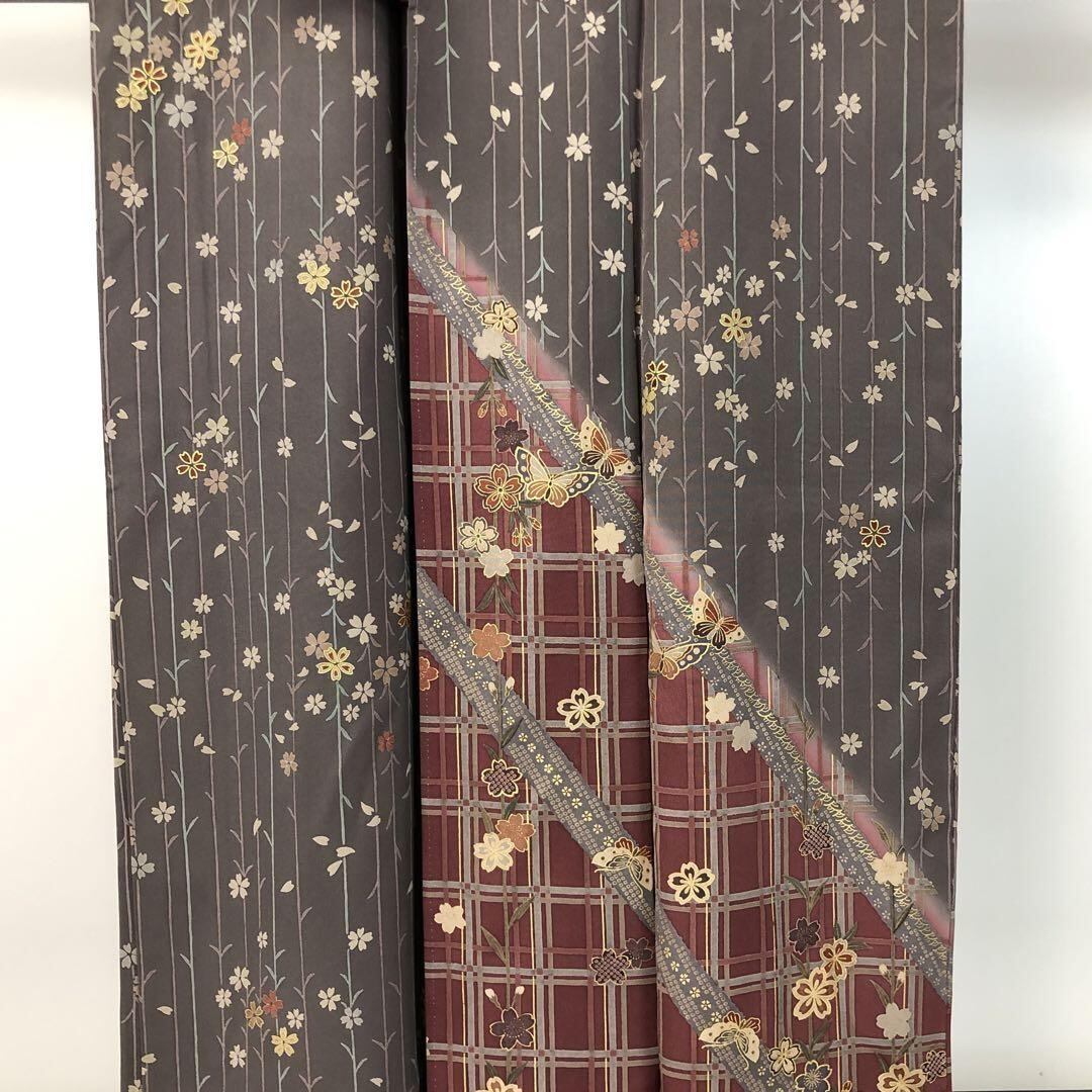 鼠志野色ベースのお色味に格子に花模様、蝶々などの柄裄がデザインされた素敵なお品でございます。