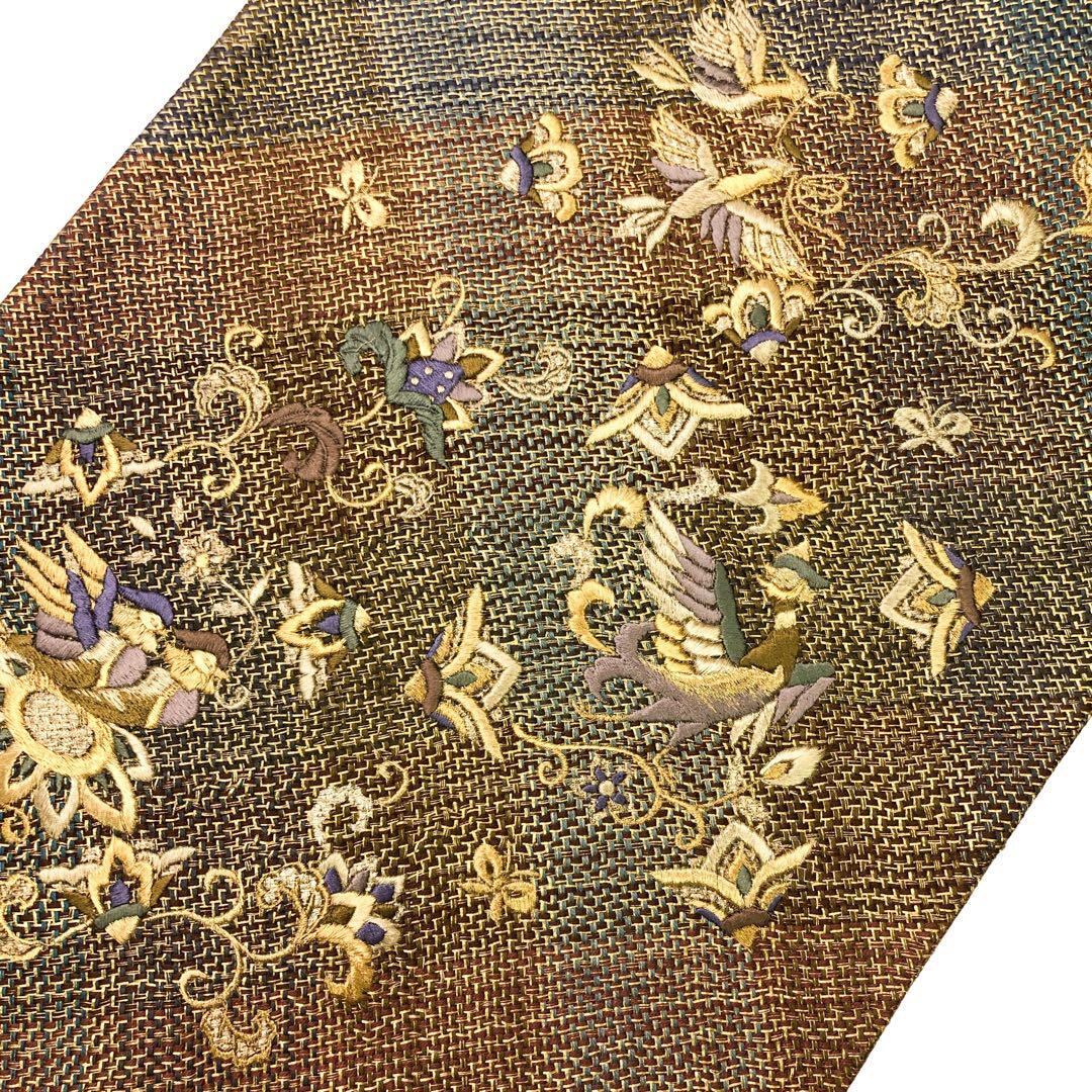 斜めのグラデーション、金糸が織り込まれた煌びやかな色彩に美しい織模様、刺繍の花唐草模様に花喰い鳥、鴛鴦などの柄裄がデザインされた素敵なお品でございます。
