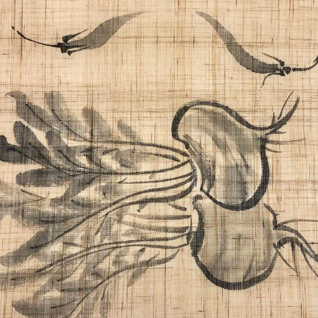 枯野色の自然な風合いのお色味に手描きの夏野菜の柄裄がデザインされた雰囲気の良い素敵なお品でございます。