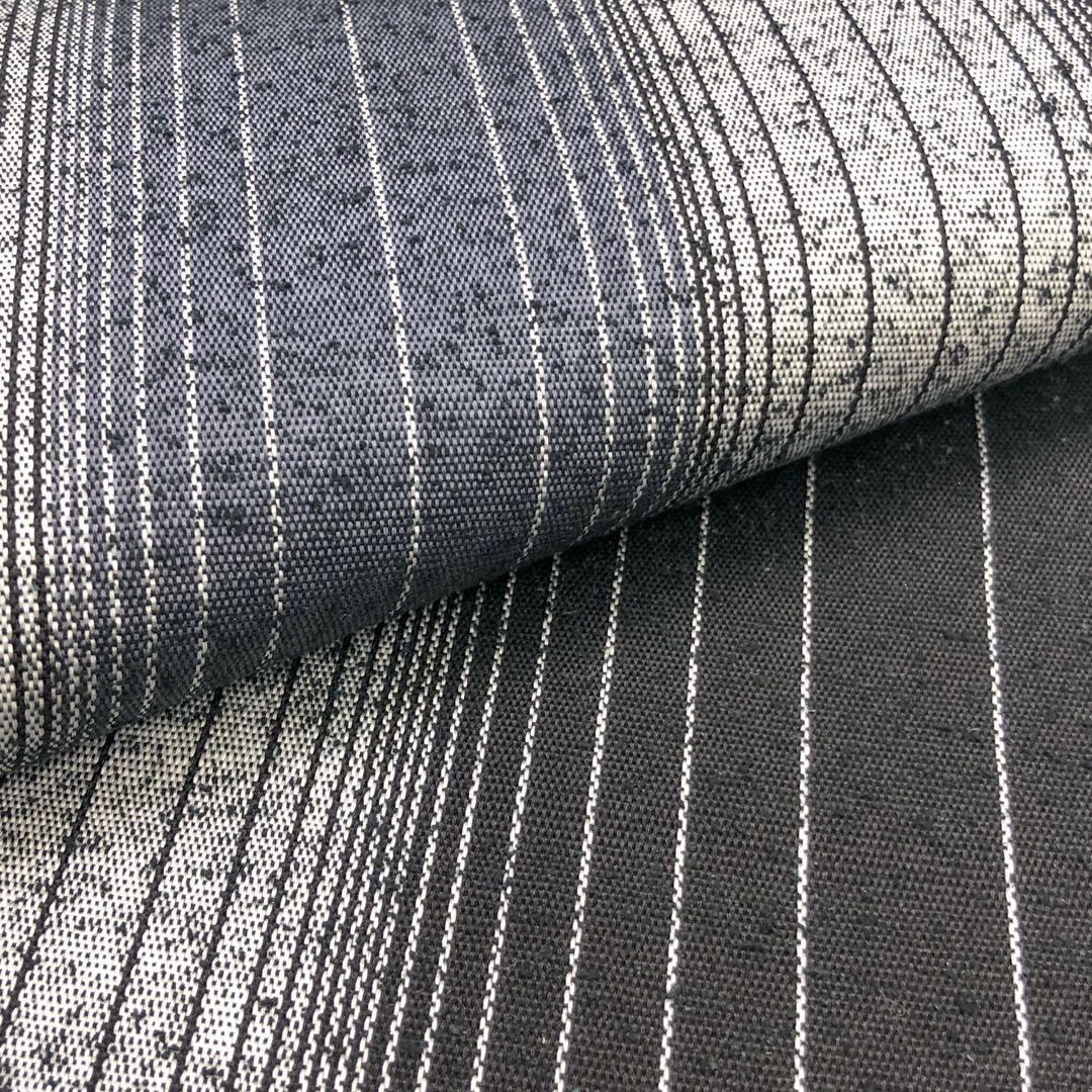 モノトーンのお色味の紬地にモダンな雰囲気の縦縞模様がデザインされた素敵なお品でございます。