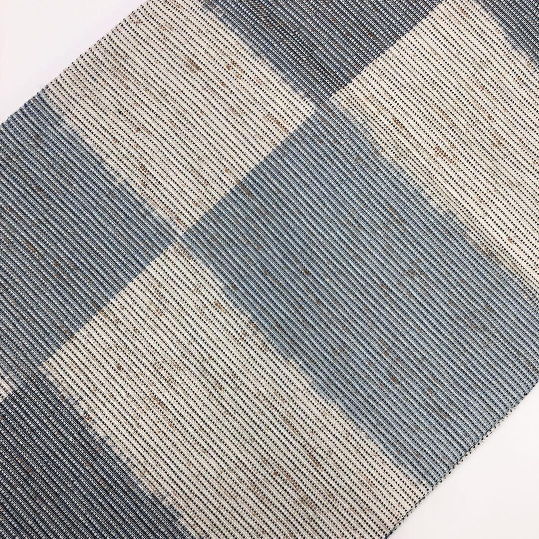 ぜんまいつむぎ織、生成色のお色味に横糸に金糸、藍染の格子柄がデザインされた雰囲気の良い素敵な柄裄のお品でございます。