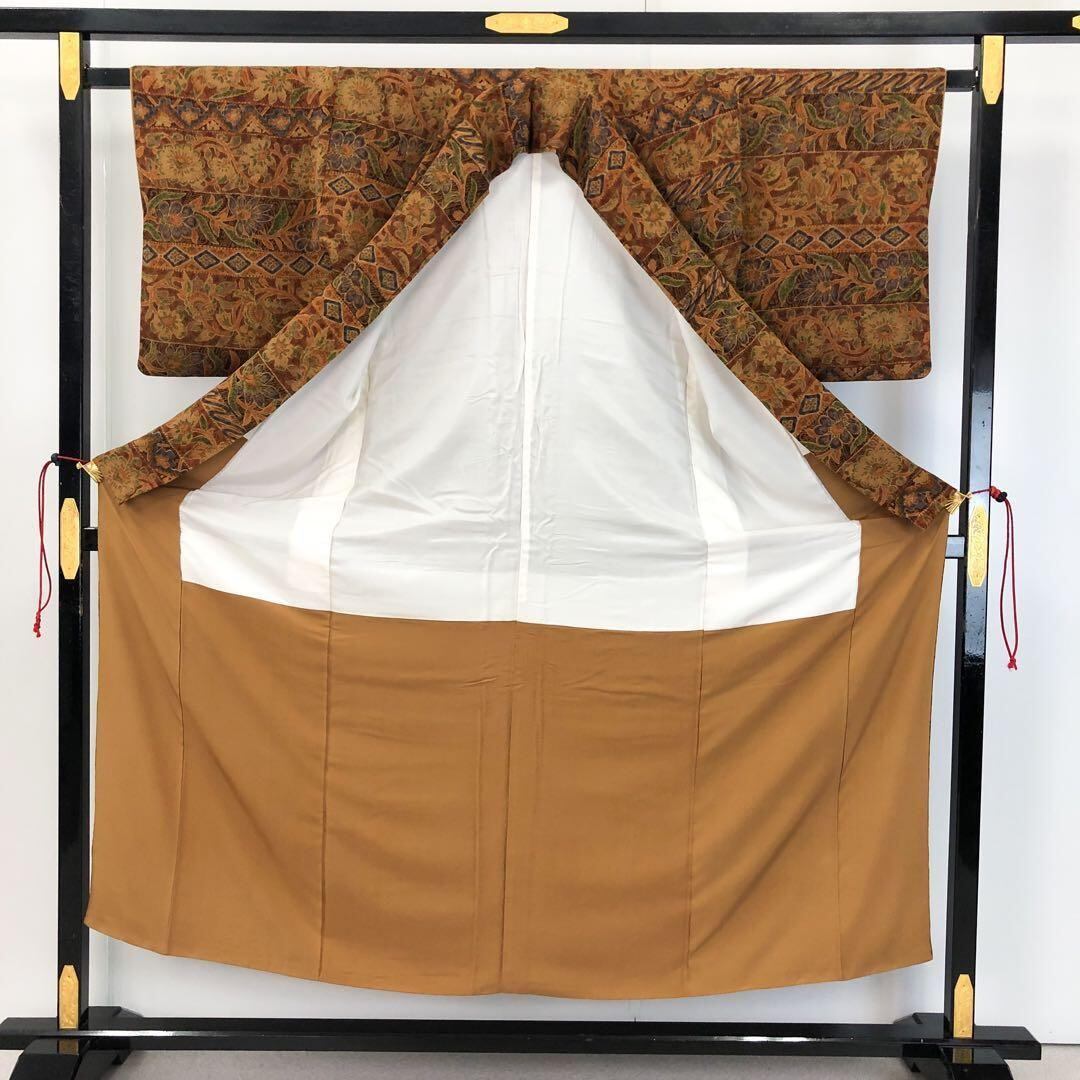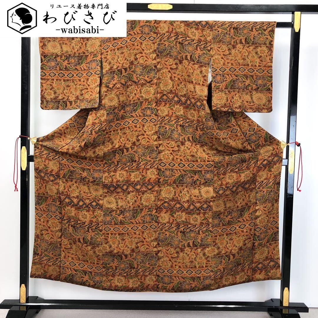 小紋 花唐草模様 濃柿色 縮緬 K-4495 着物 きもの kimono 和服 和装 中古 リサイクル着物 【送料無料】