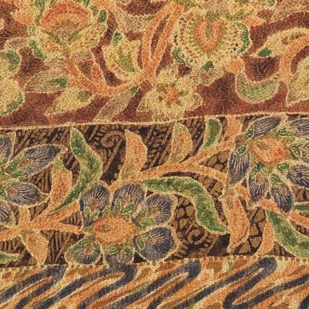 濃柿色ベースの落ち着きのあるお色味の縮緬地に花唐草模様の柄裄がデザインされた素敵なお品でございます。