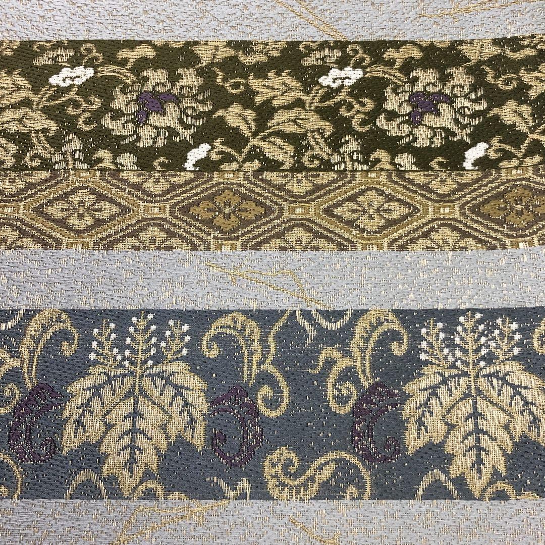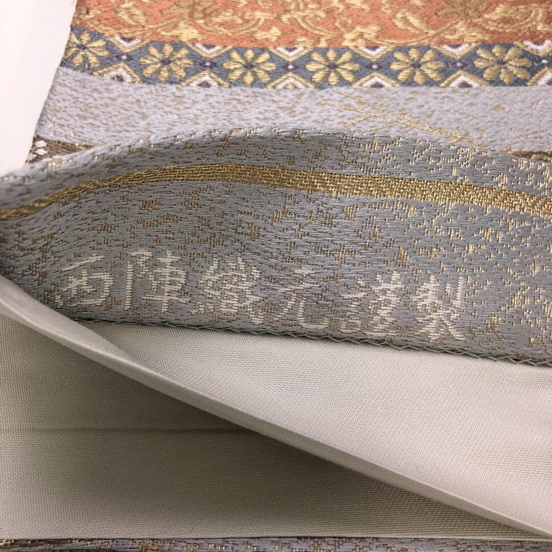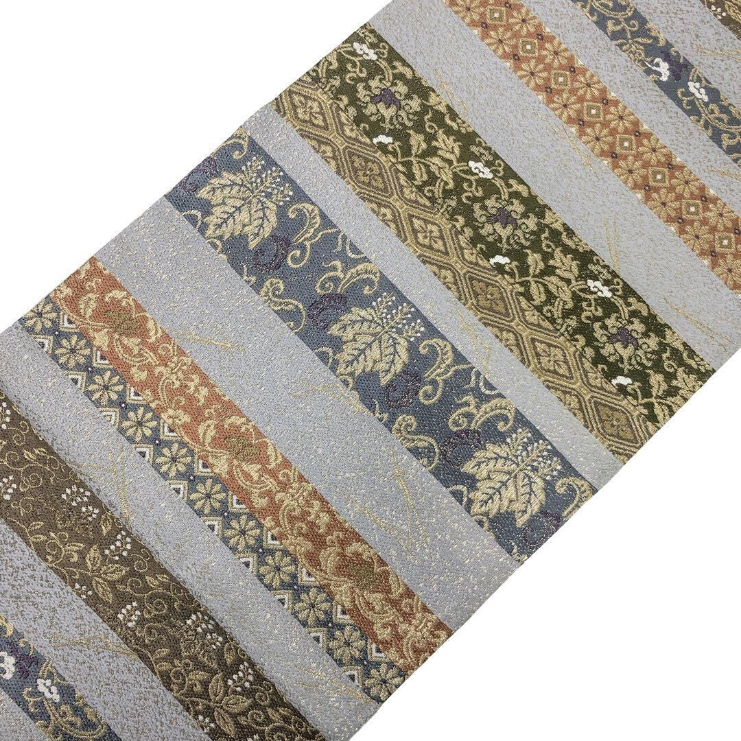 袋帯 西陣織元謹製 古代間道 横縞に花唐草模様 空色鼠色 O-4868 着物 きもの kimono 和服 和装 中古 リサイクル着物 【送料無料】