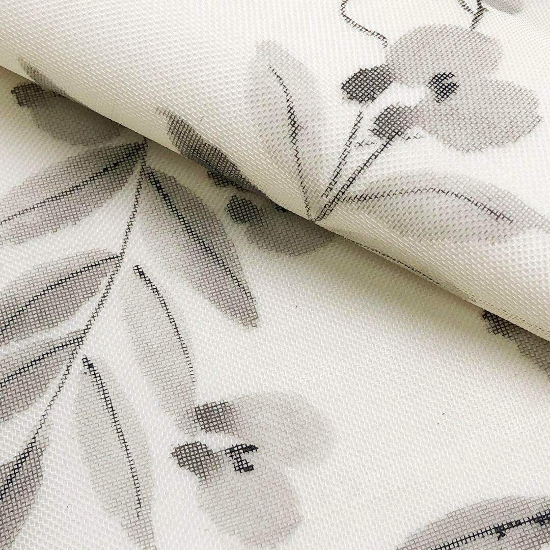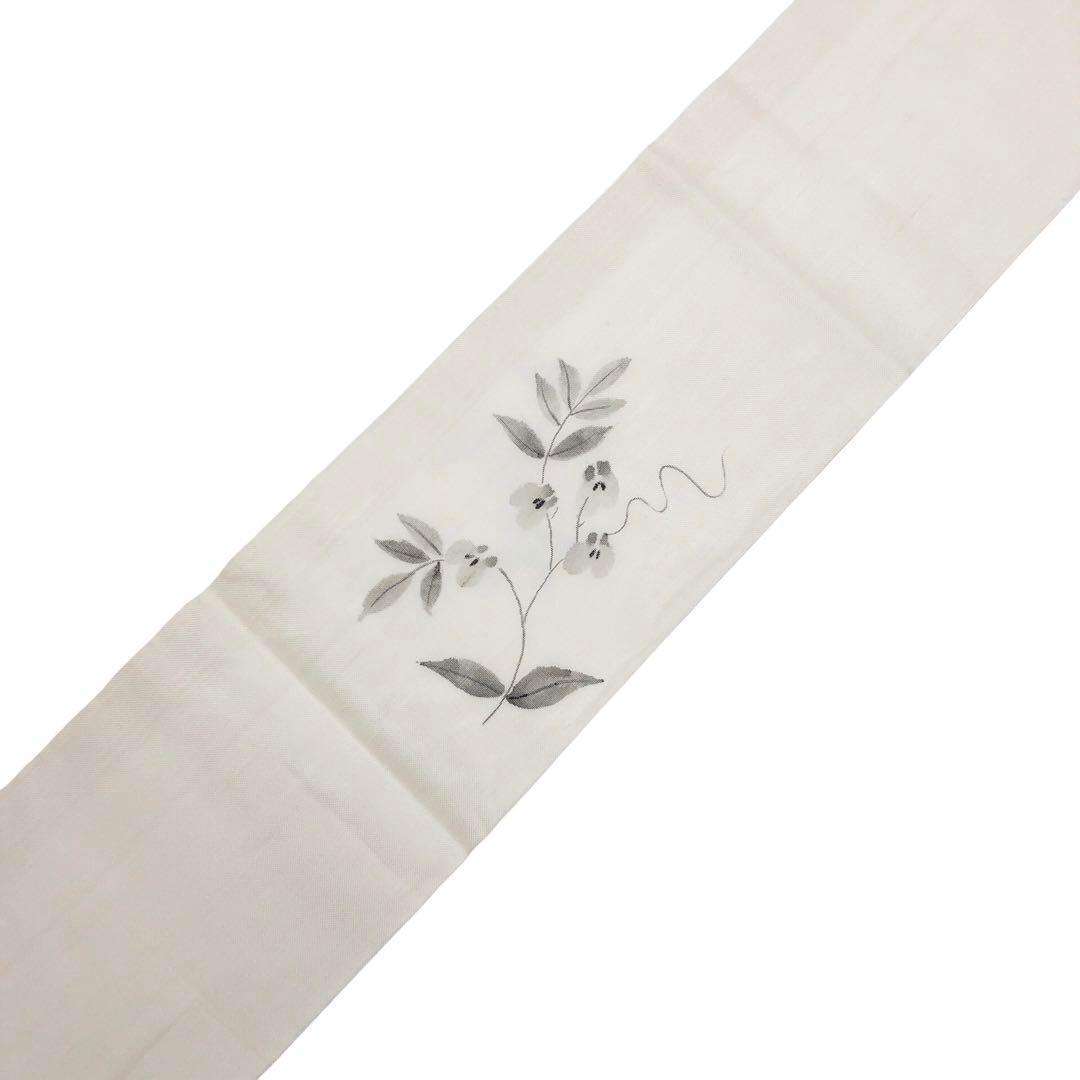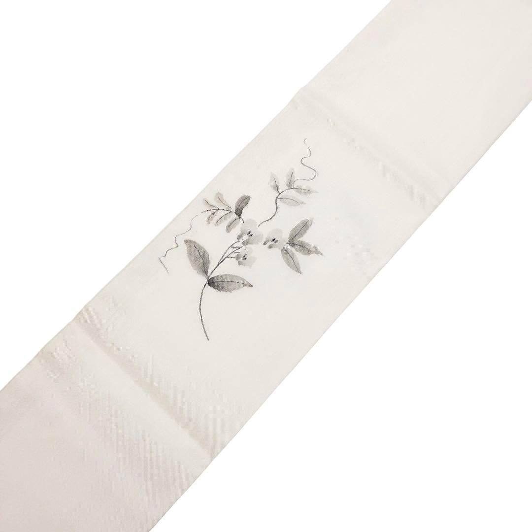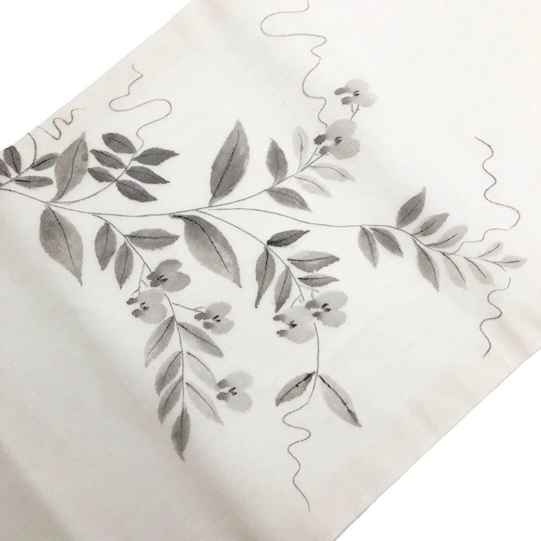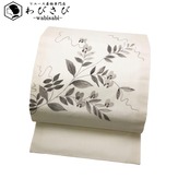 乳白色の上品なお色味に手描きの花草模様の柄裄がデザインされた雰囲気の良い素敵なお品でございます。