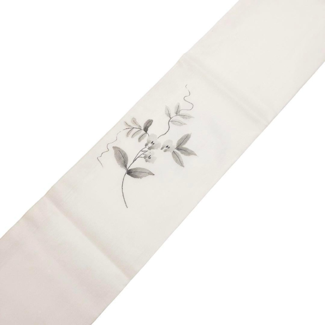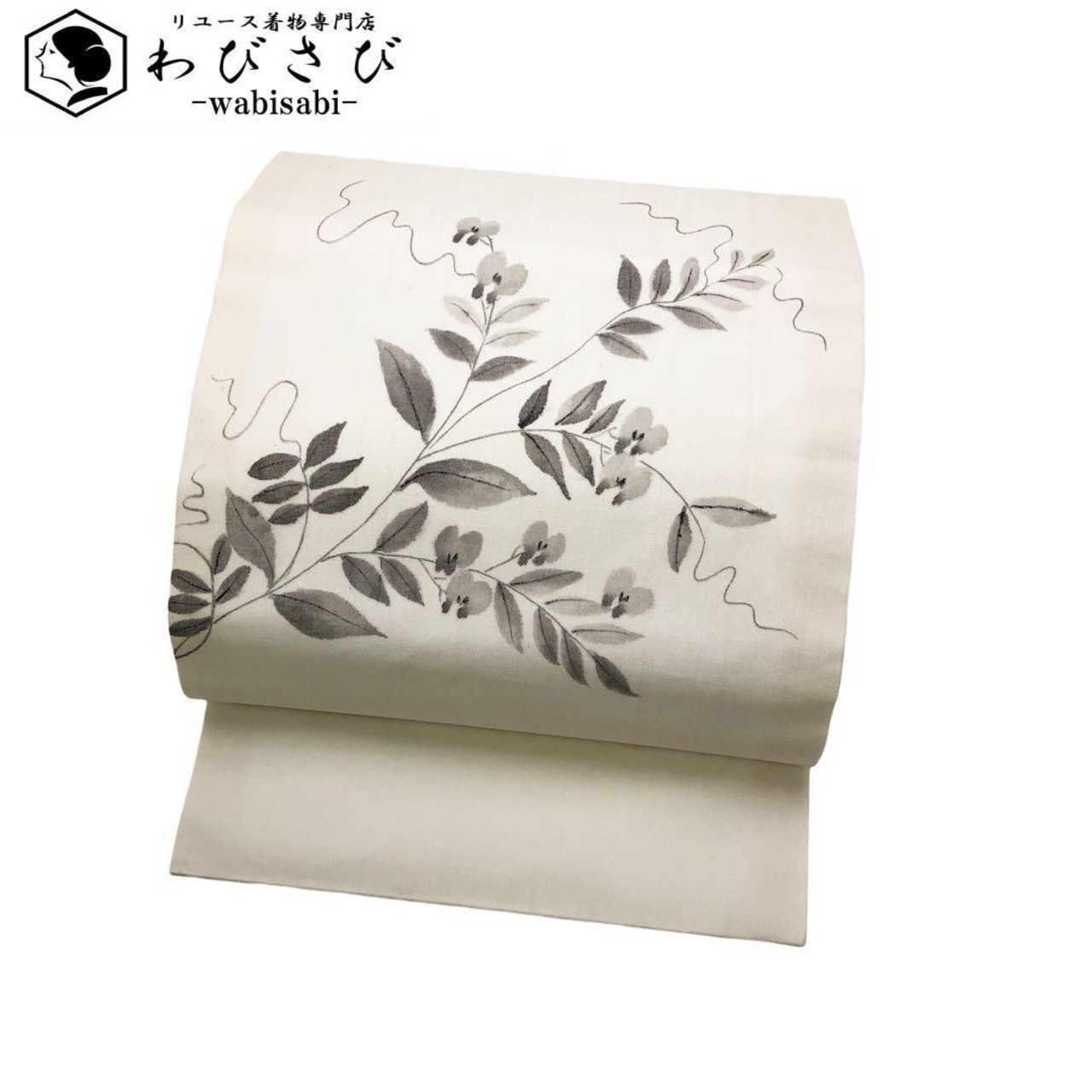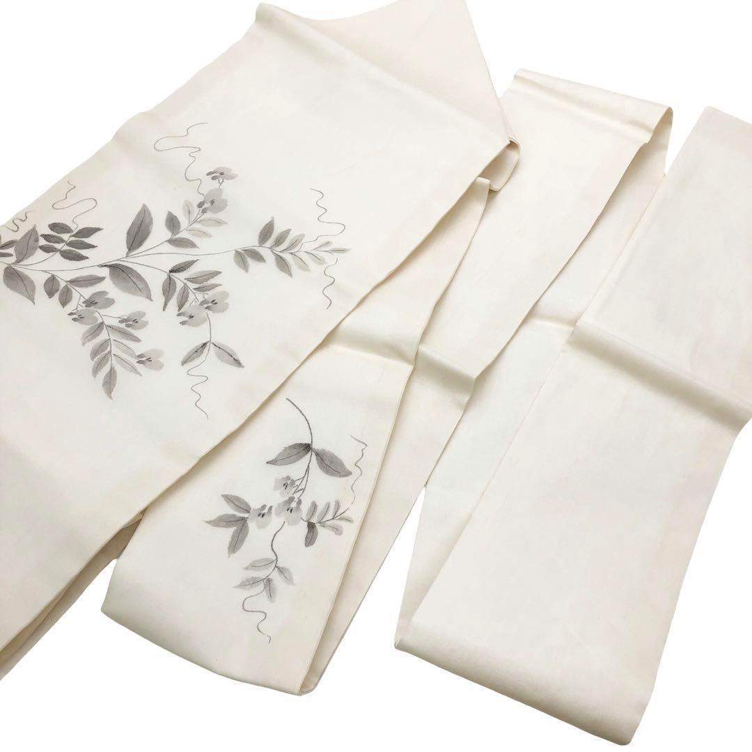 乳白色の上品なお色味に手描きの花草模様の柄裄がデザインされた雰囲気の良い素敵なお品でございます。