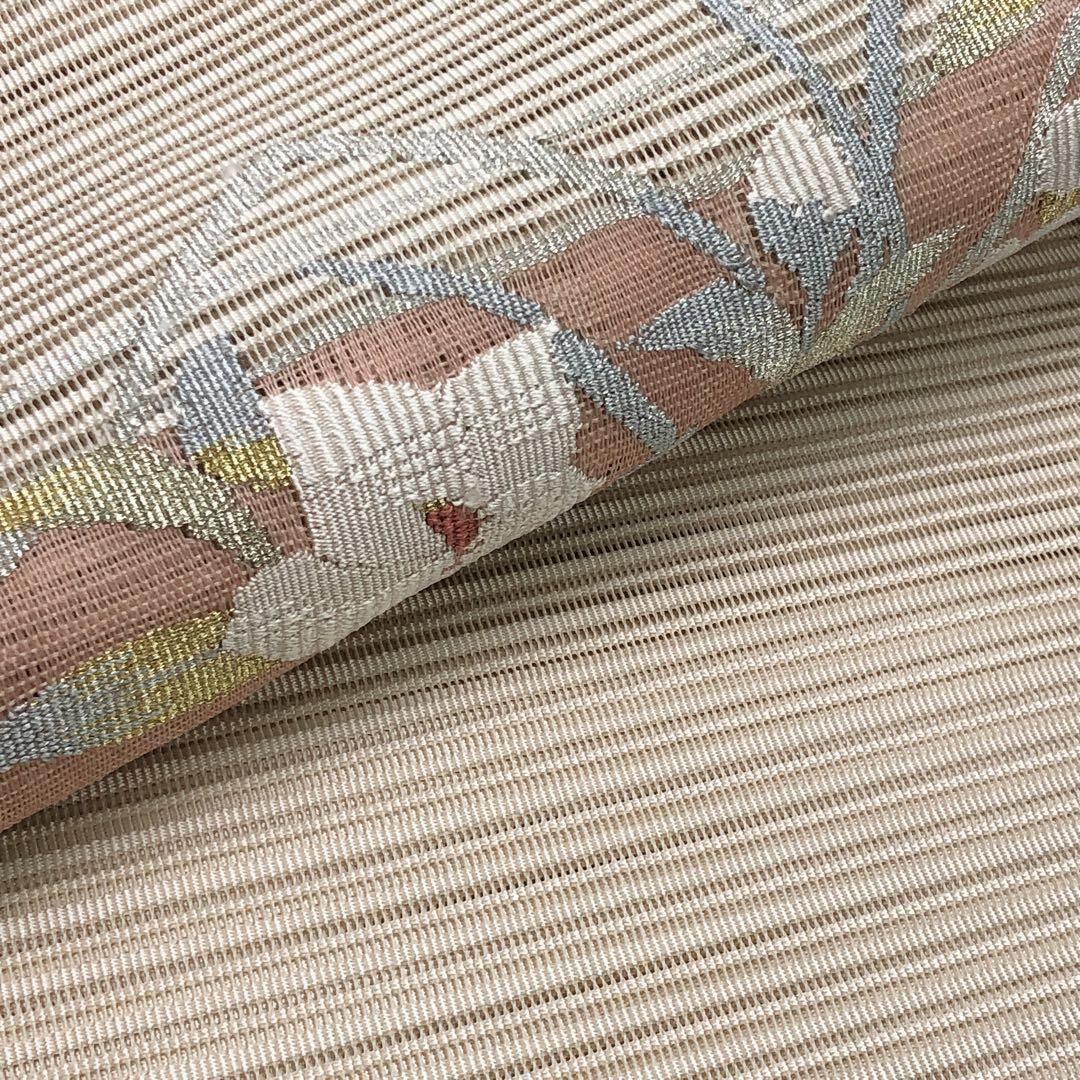 夏帯 名古屋帯 絽綴れ 流水に花柄模様 鳥の子色 金銀糸 O-4880 着物 きもの kimono 和服 和装 中古 リサイクル着物 【送料無料】