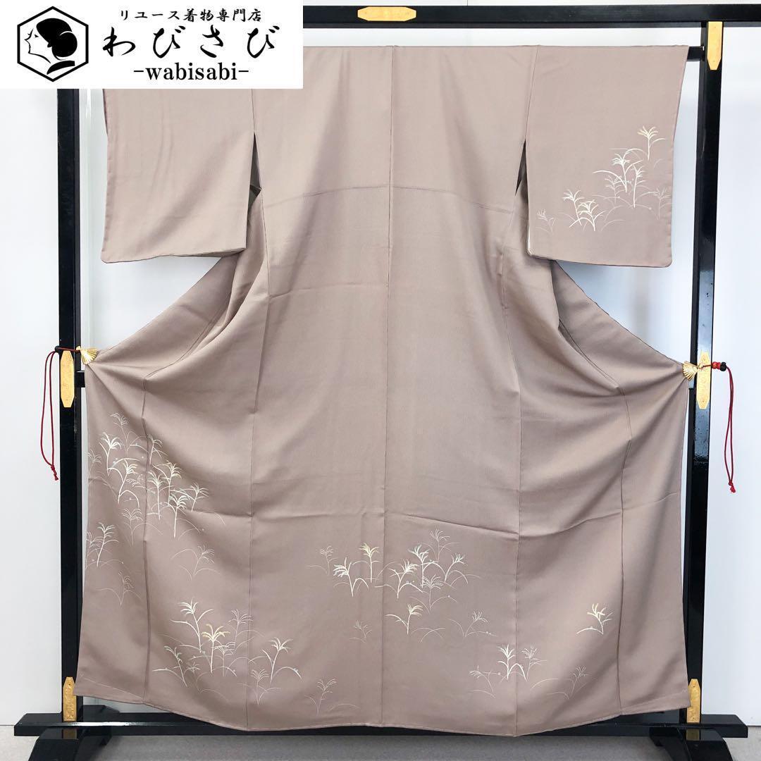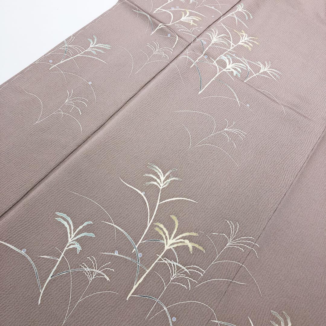 梅鼠色の落ち着きのあるお色味の縮緬に上品な草模様がデザインされた素敵な柄裄のお品でございます。