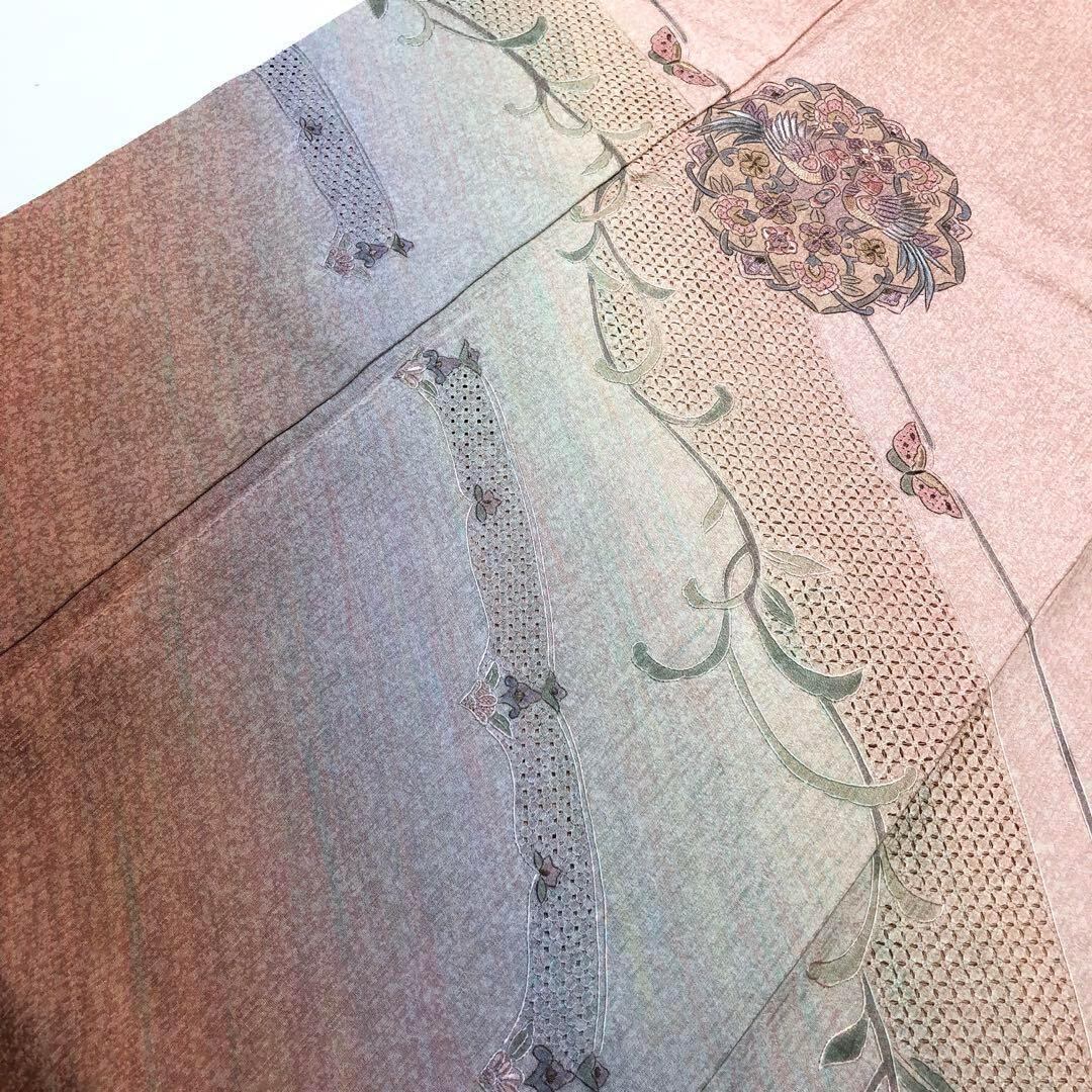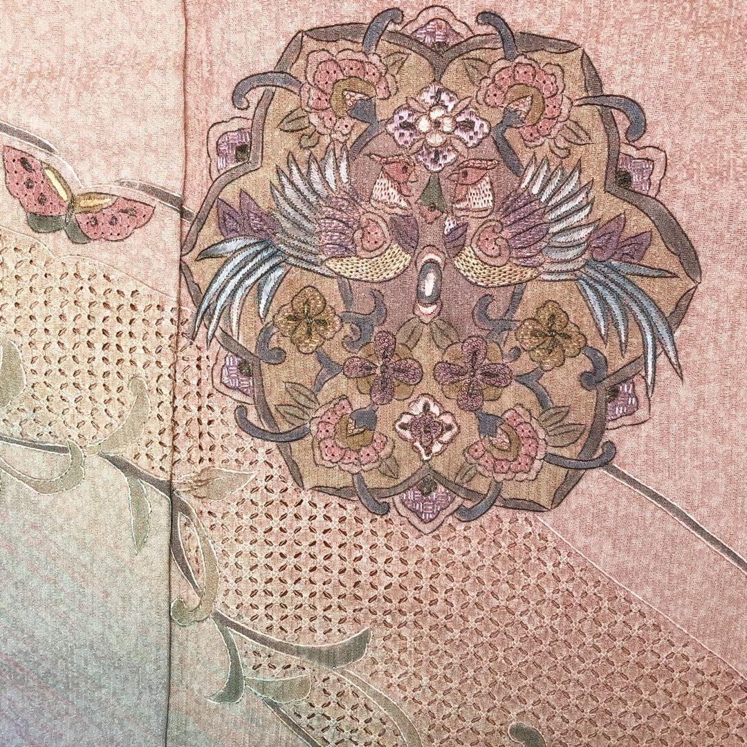桃染色ベースのお色味にグラデーション、汕頭刺繍、相良刺繍などの刺繍柄の華柄模様、鳥、蝶々などの柄裄がデザインされた素敵な柄裄のお品でございます。