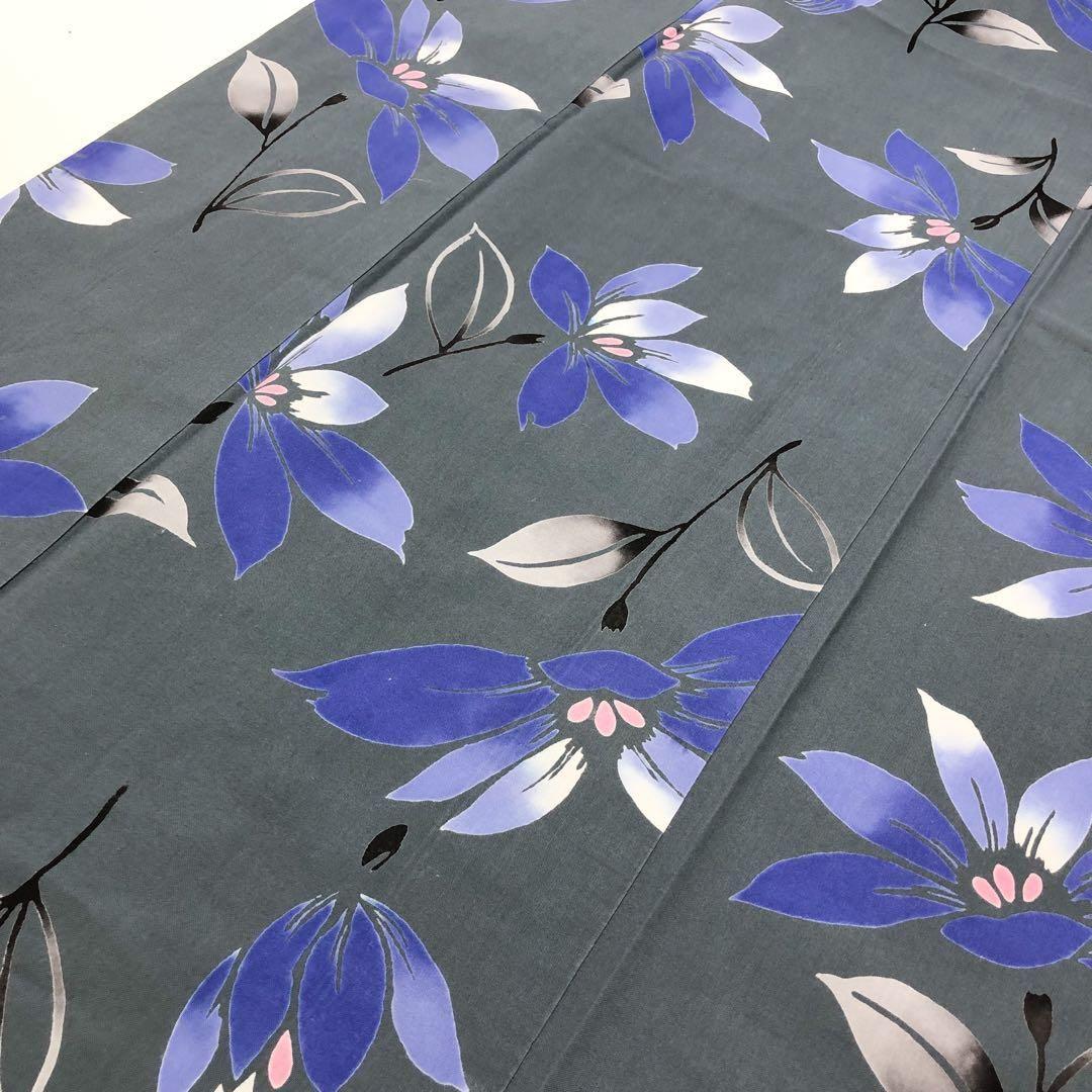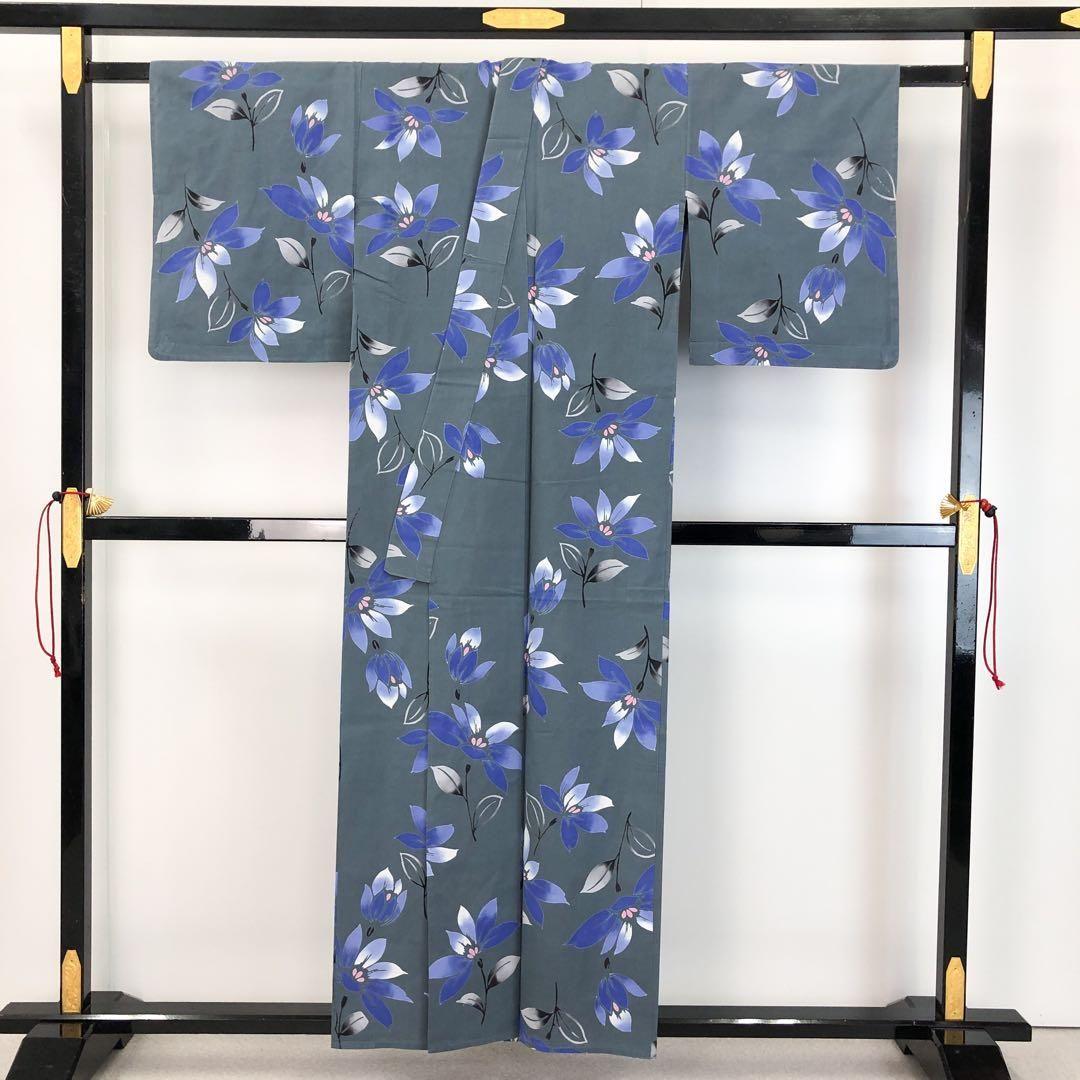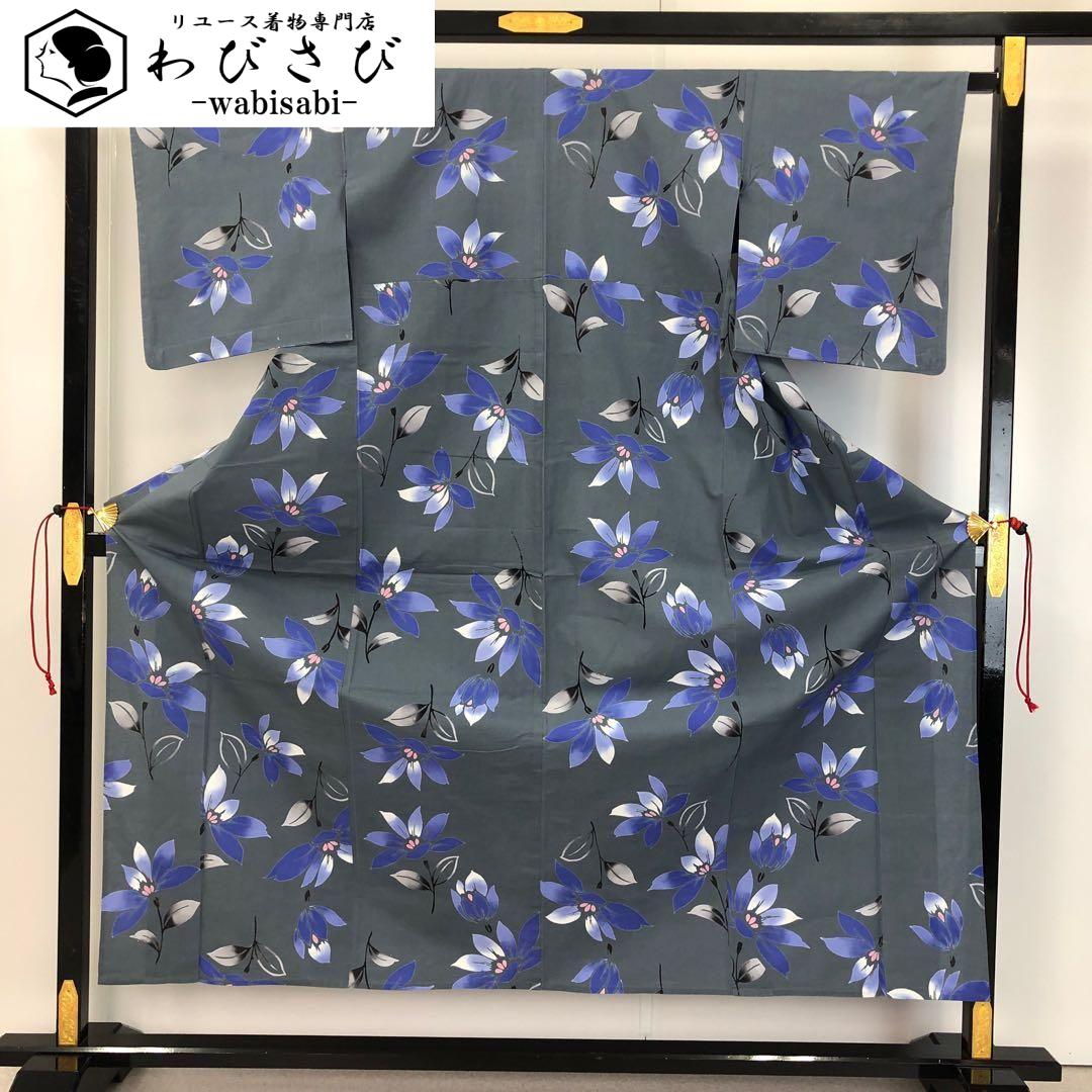 夏着物 浴衣 花模様 灰青色 K-4507 着物 きもの kimono 和服 和装 中古 リサイクル着物 【送料無料】