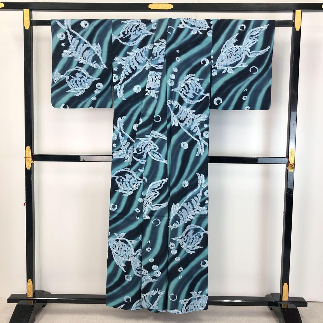 夏着物 浴衣 抽象魚模様 紺鉄色 K-4505 着物 きもの kimono 和服 和装 中古 リサイクル着物 【送料無料】