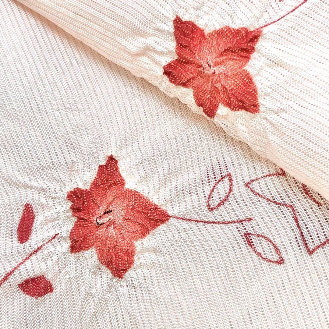 乙女色のお色味に絞りで花模様がデザインされた品のある素敵な柄裄のお品でございます。
