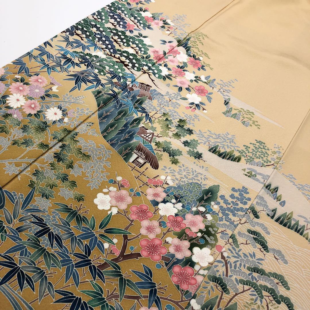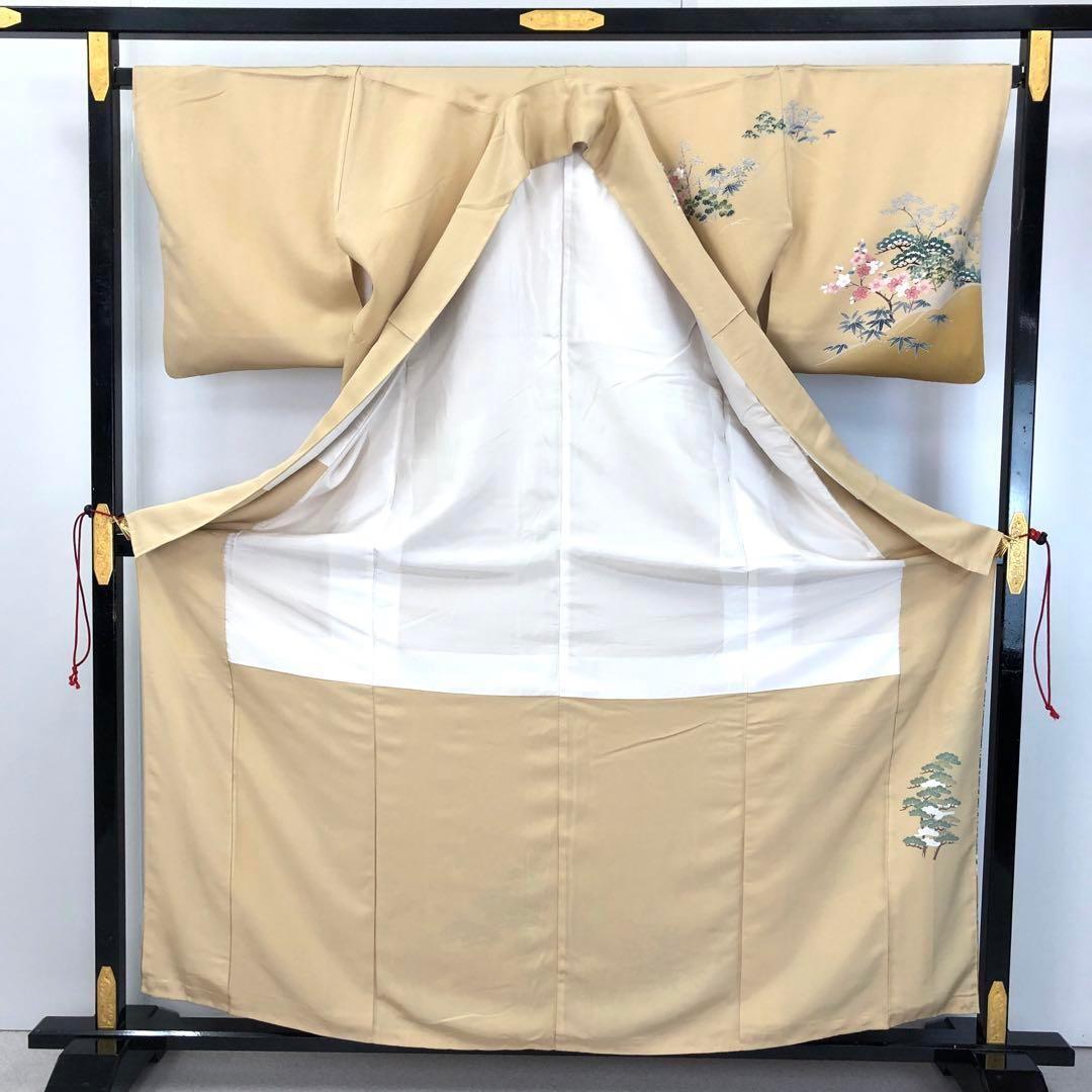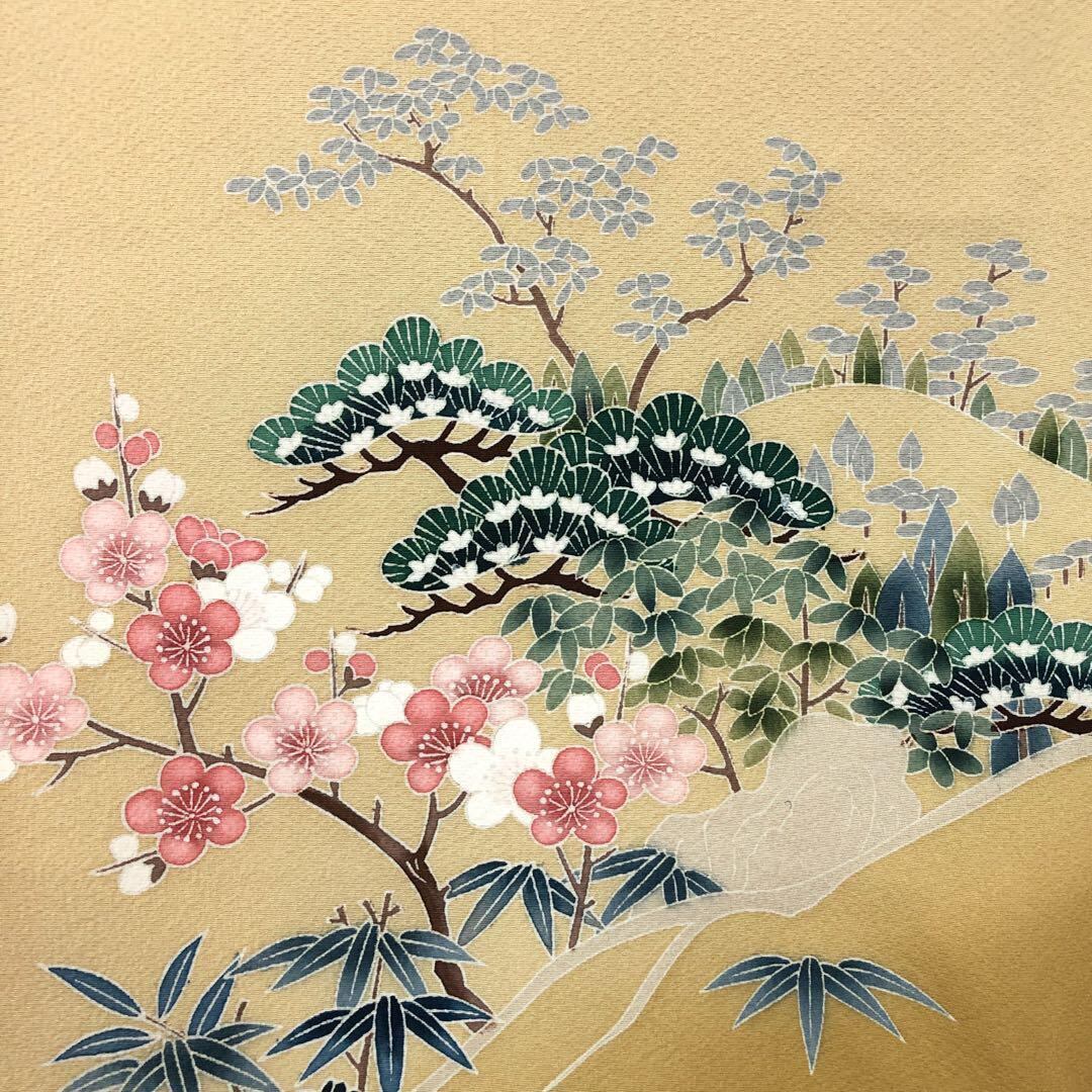 鳥の子色のお色味に松竹梅や流水模様などの友禅の美しい柄裄がデザインされた素敵なお品でございます。